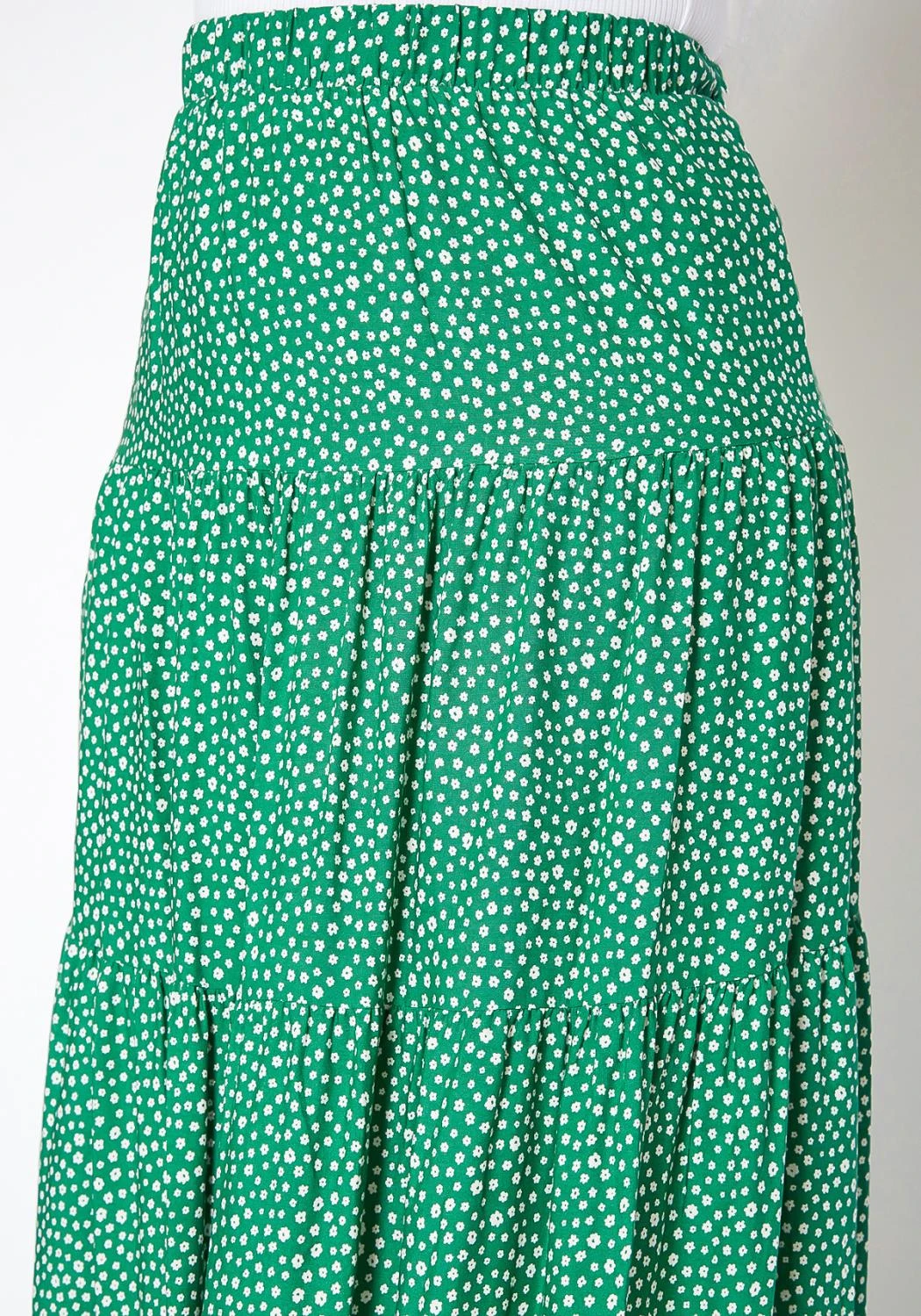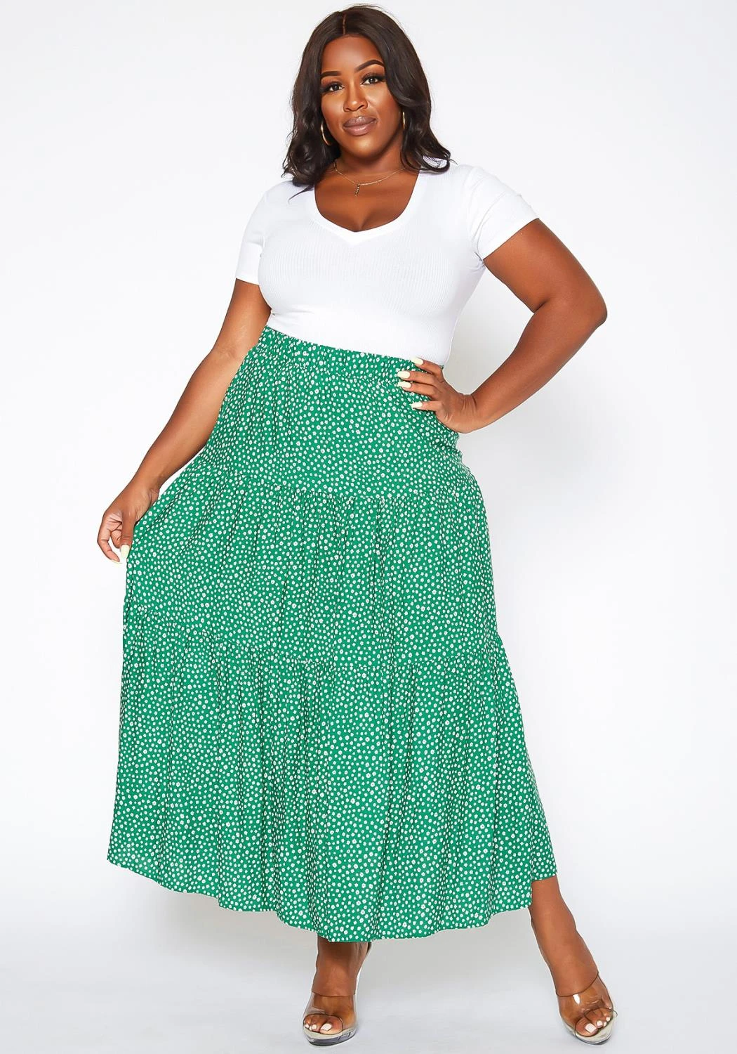 Lovely maxi skirt for plus size women in dainty floral print, high waist style, tiered design and wide flare.