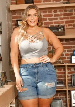 Plus size women’s chic overall shorts in greek key print and sheen material.