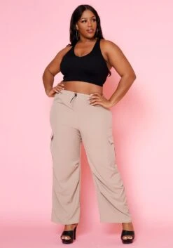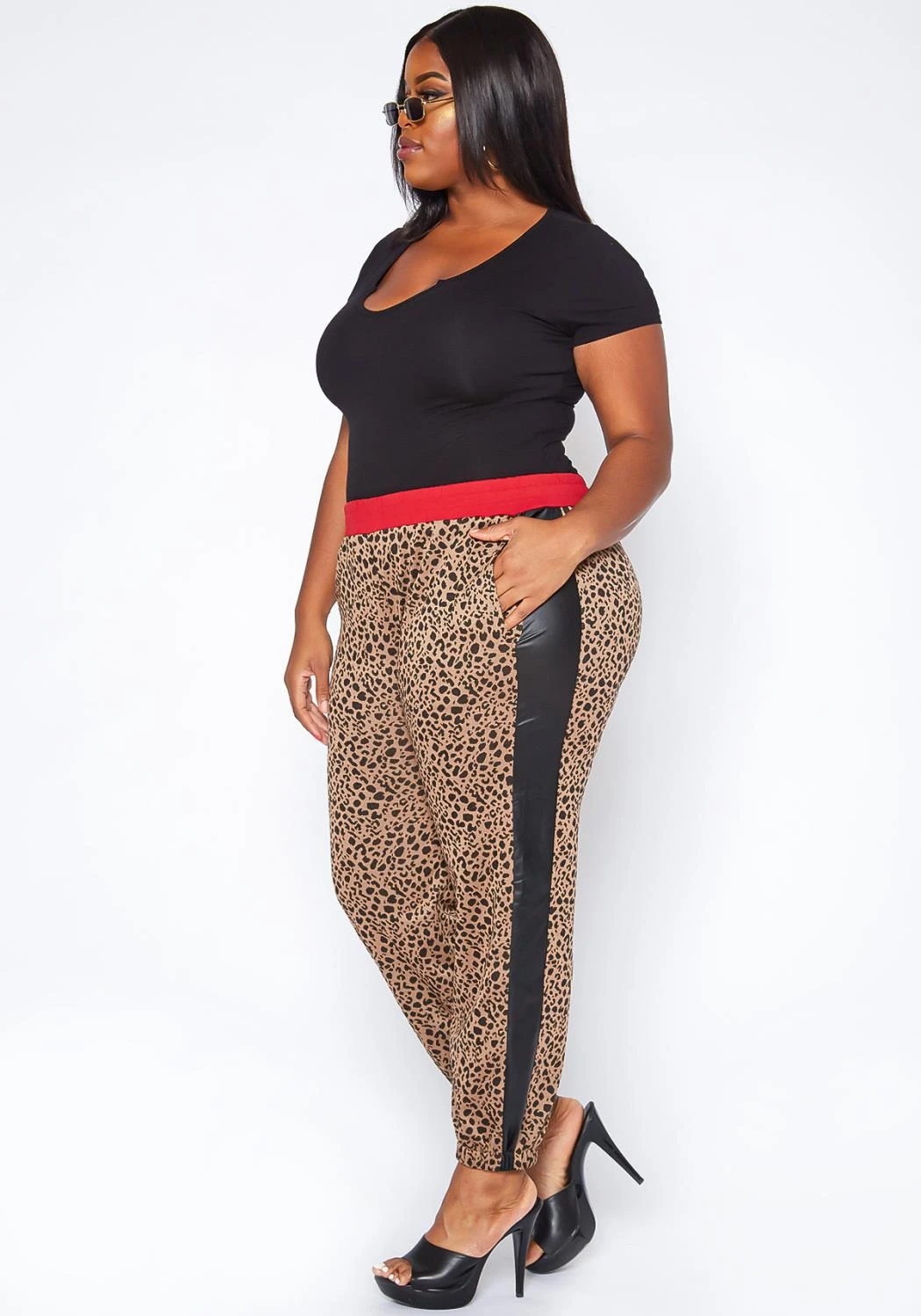 So stylish plus size women’s jogger pants in leopard print design, faux leather tape line, red waistline trim, cuffed ankle hem and pocket ascent.