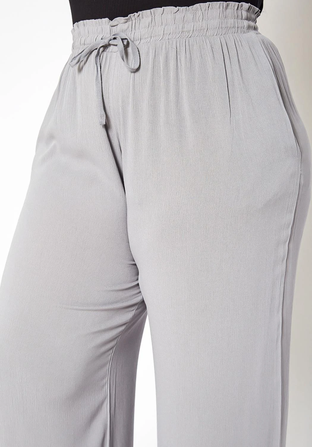 Casual palazzo pants in lightweight semi-sheer material, drawstring waistline, pocket ascent and straight leg fitting.