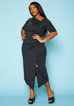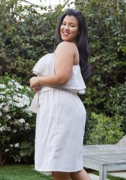 One of a kind plus size women’s maxi dress in polka dot patterned mesh, ruffle trim details, fitted long sleeves, mock neck, fit to flare design, cinched waistband, buttoned wrist cuffs and back zipper closure.