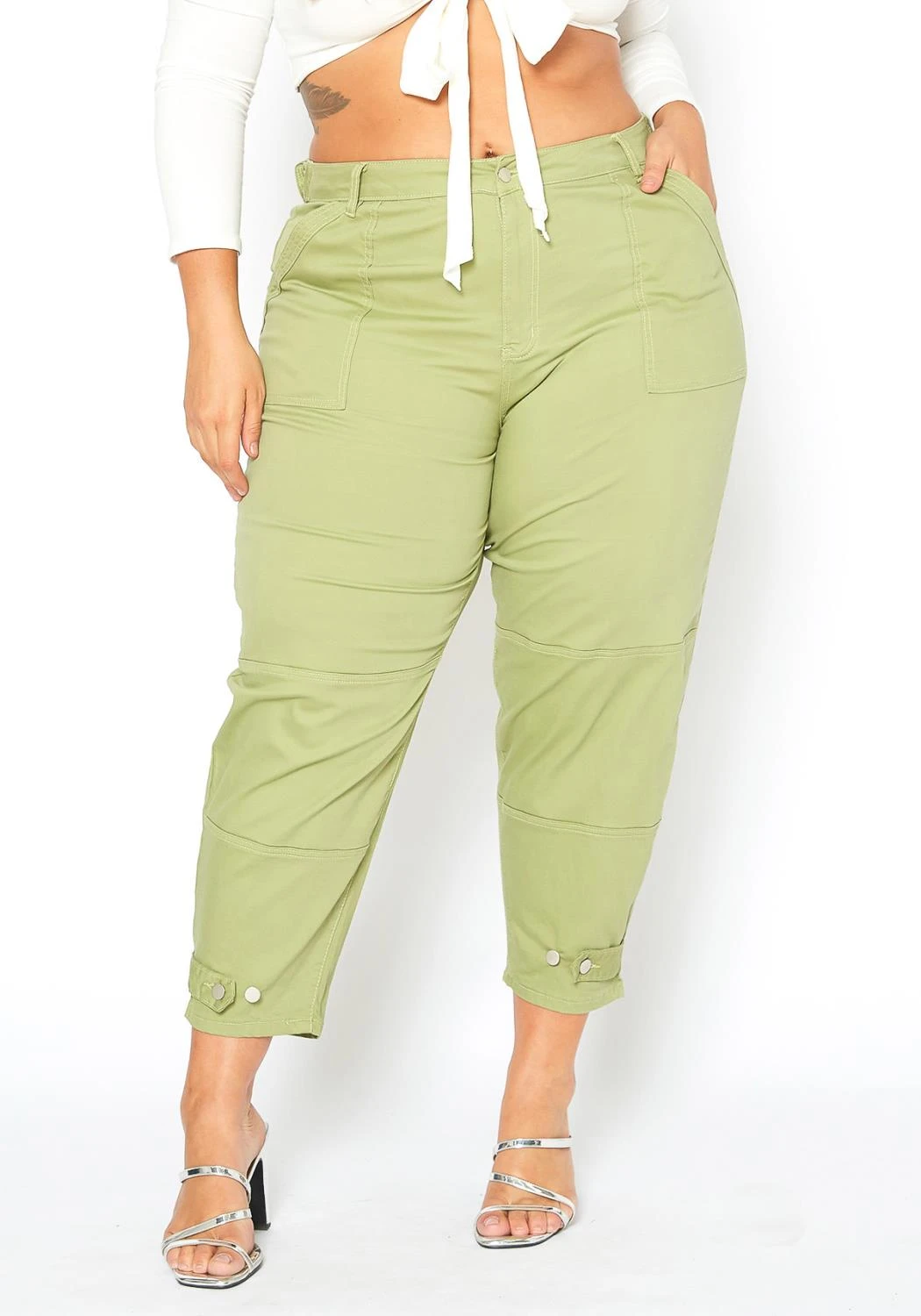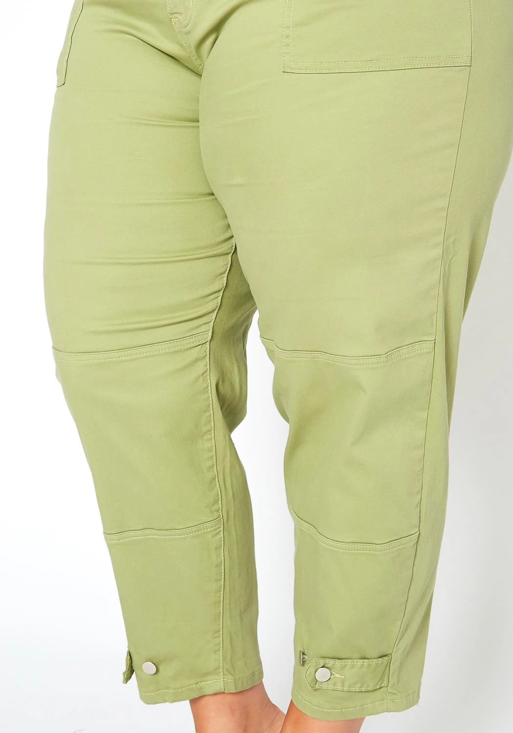 Fresh and trendy plus size women’s utility cargo pants in lovely sage green color plus features belt loop holes, pockets and button ankle ascent.