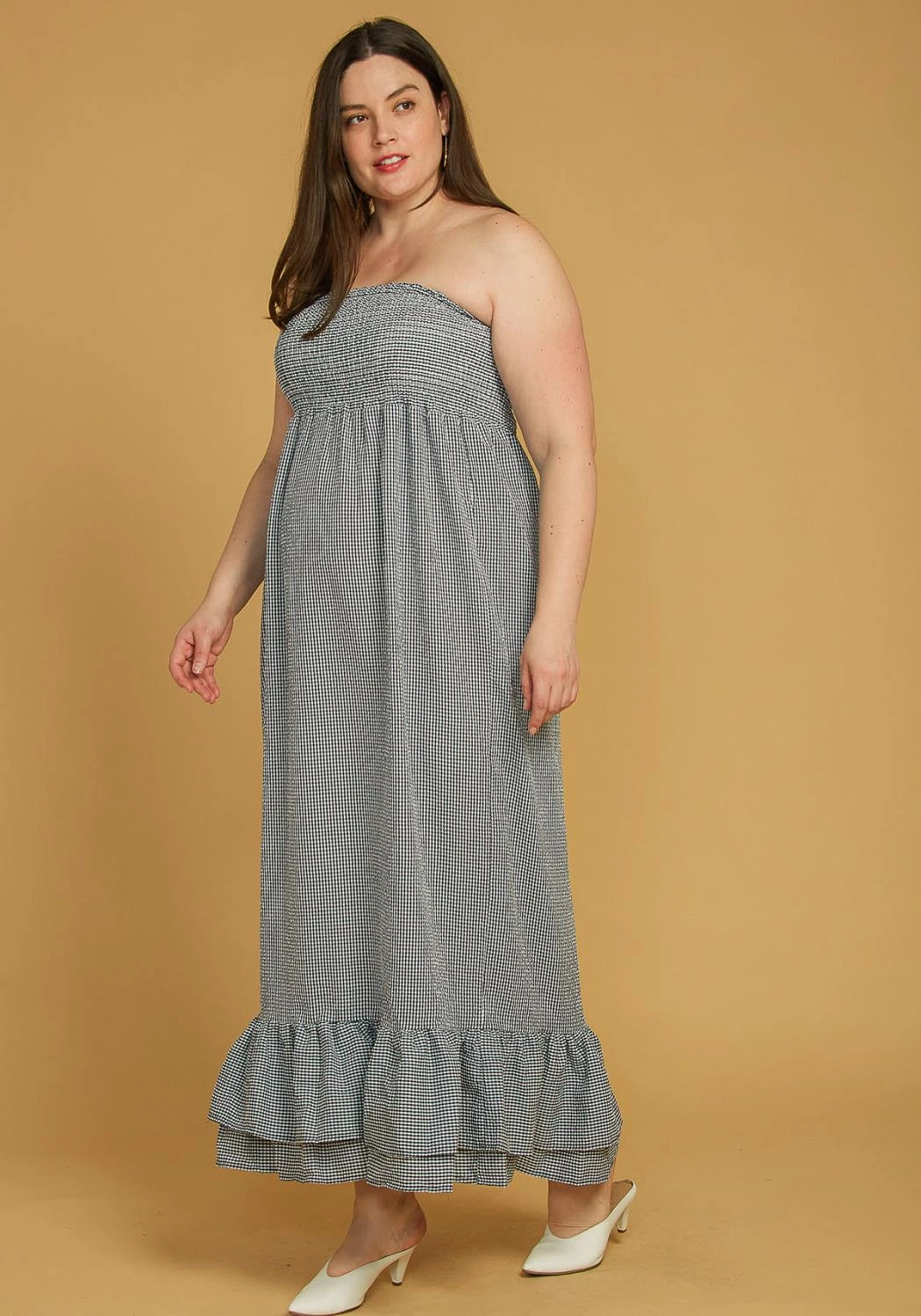 Sleeveless grid print maxi dress with two layer mermaid tail finish.