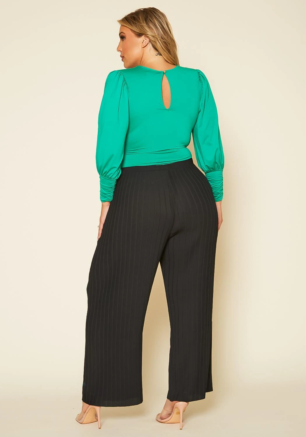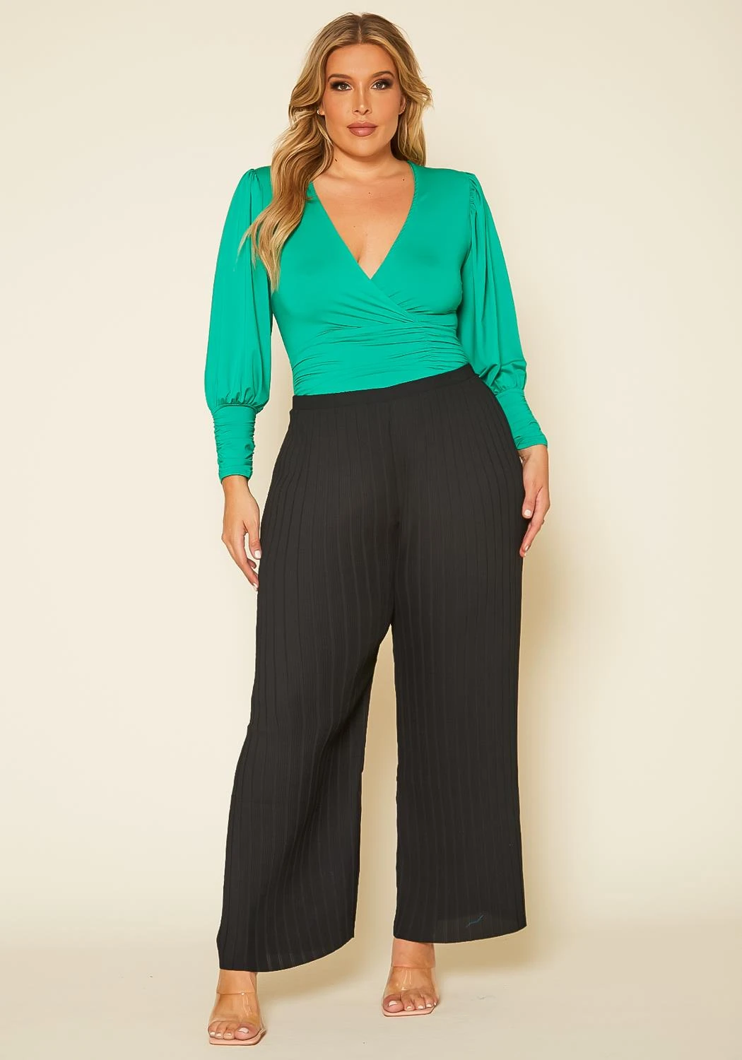Plus size women’s pants featuring a pleated style, high waist hem & wide leg ascent.