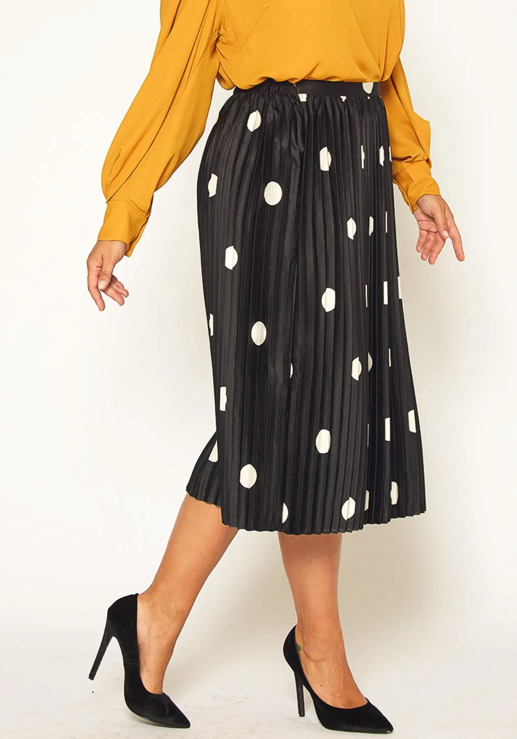 Plus Size women’s polkadot printed pleated midi skirt with elastic waist band.