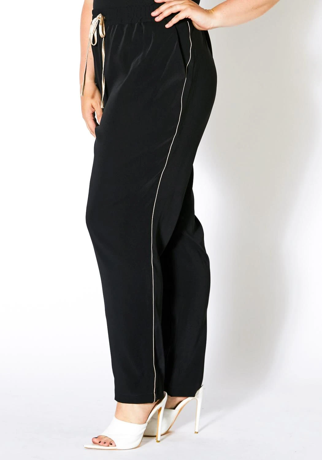 Plus size women’s casual high waisted straight fit pants with elastic waist band.