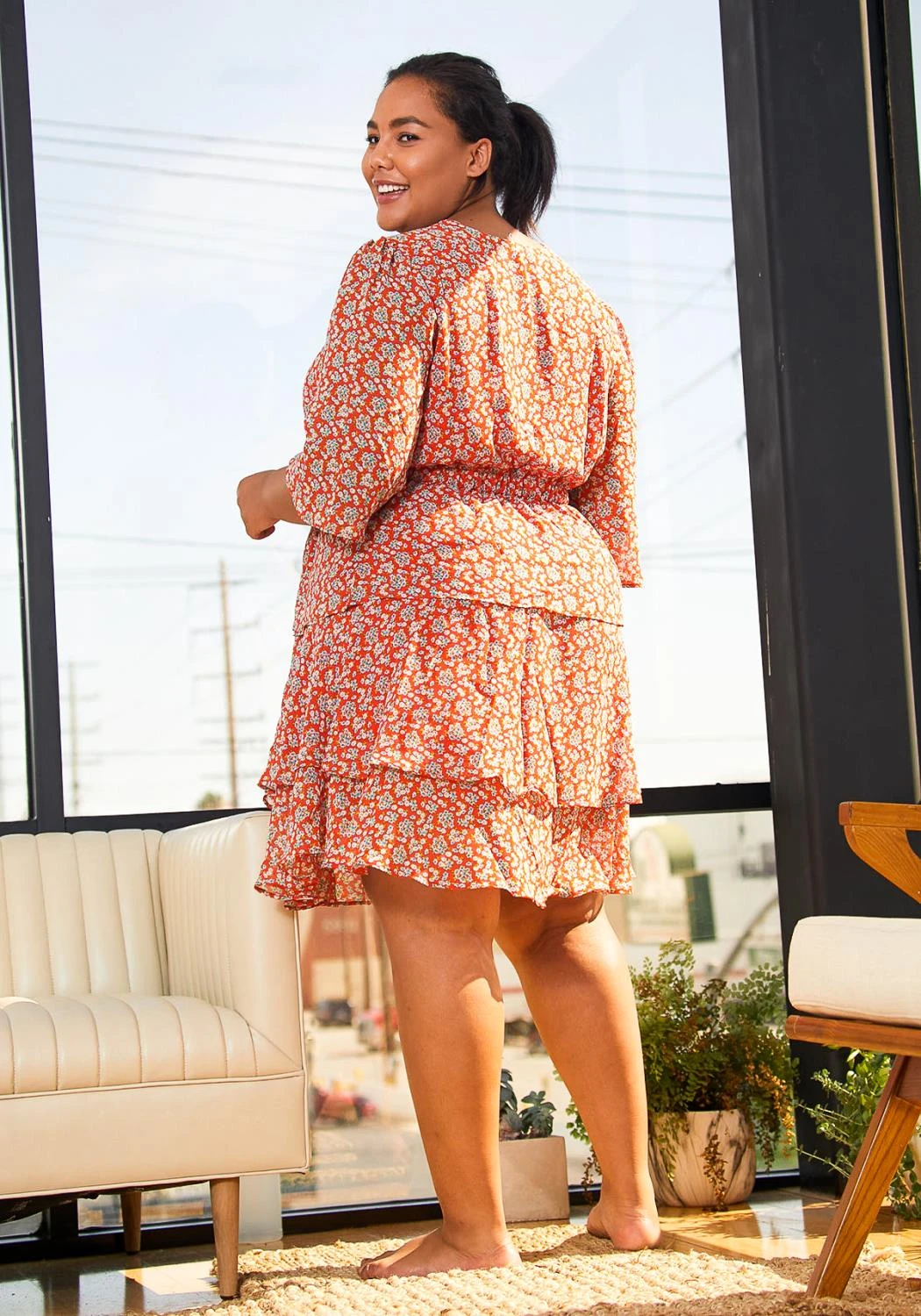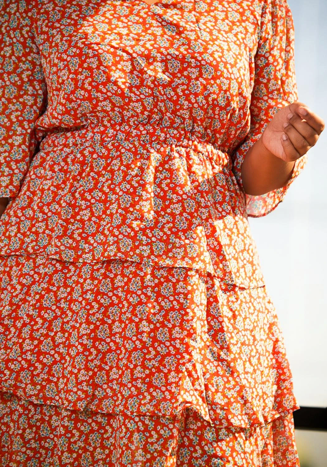 Pleione’s dreamy floral patterned dress with tiered layers and a surplice neck