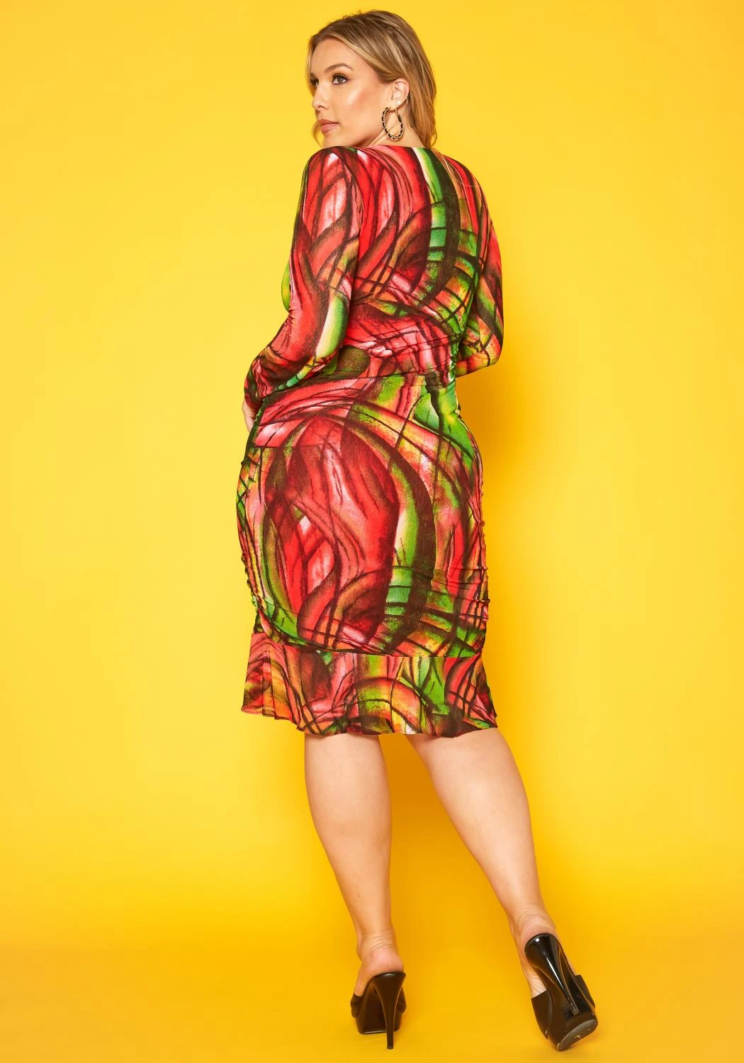 Plus size women’s mini dress with beautiful color hue mix which features a v-neck style, fitted long sleeves, drawstring ascent and mini flare hem.