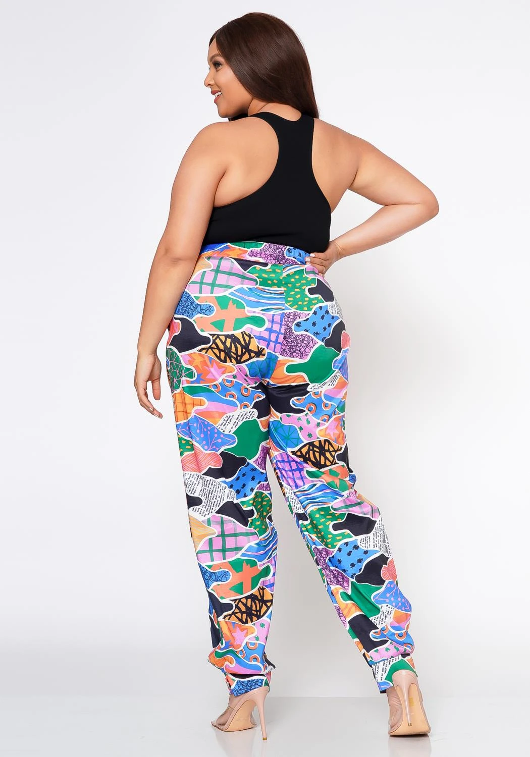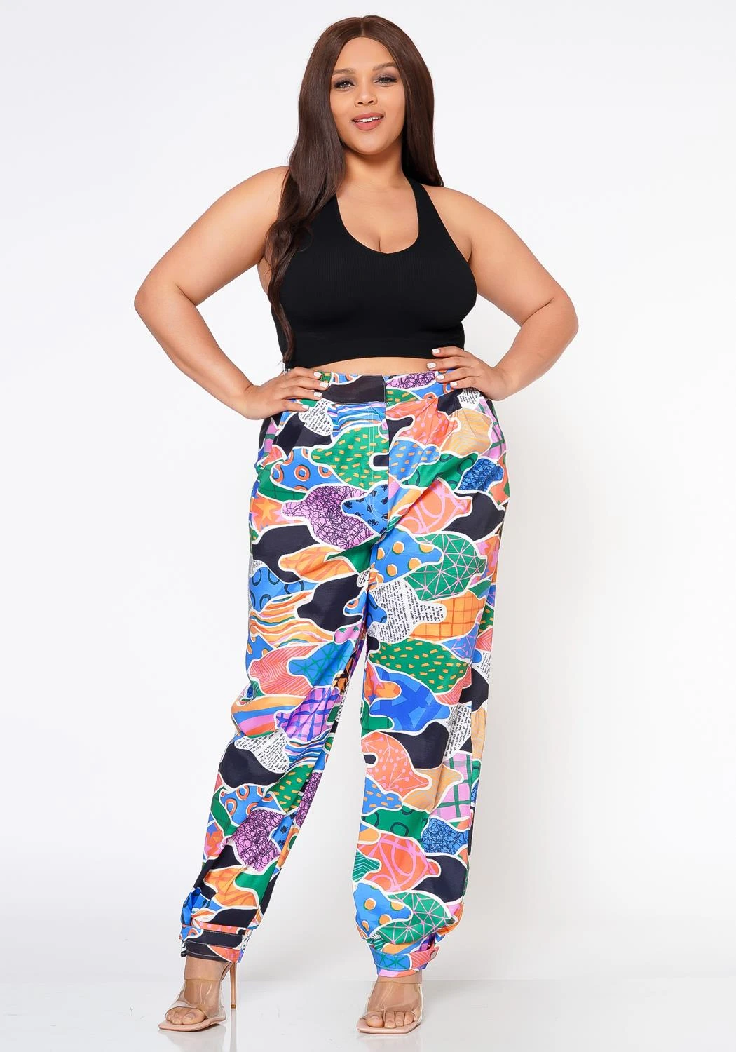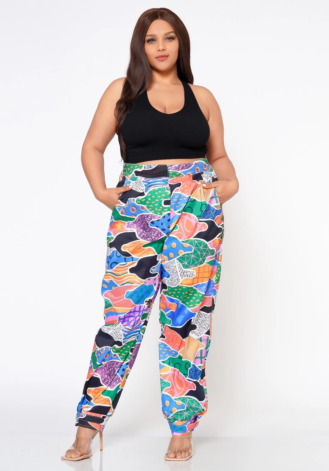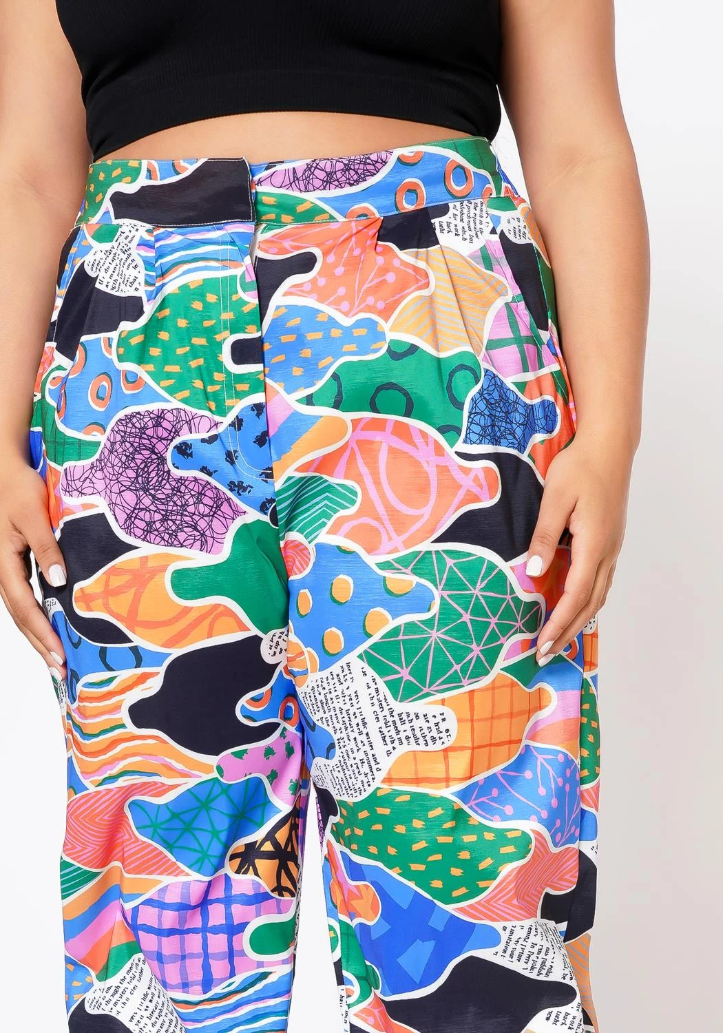 Make a statement with these abstract pattern pants that feature a high waist style, pocket hem and ankle cuff hem.