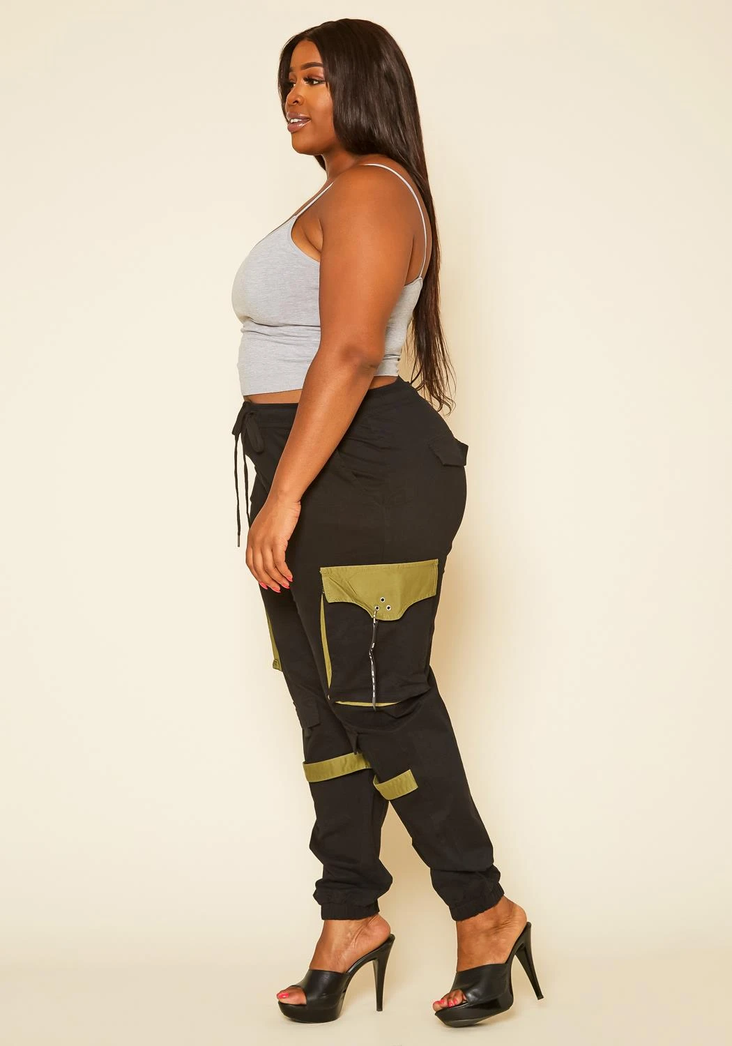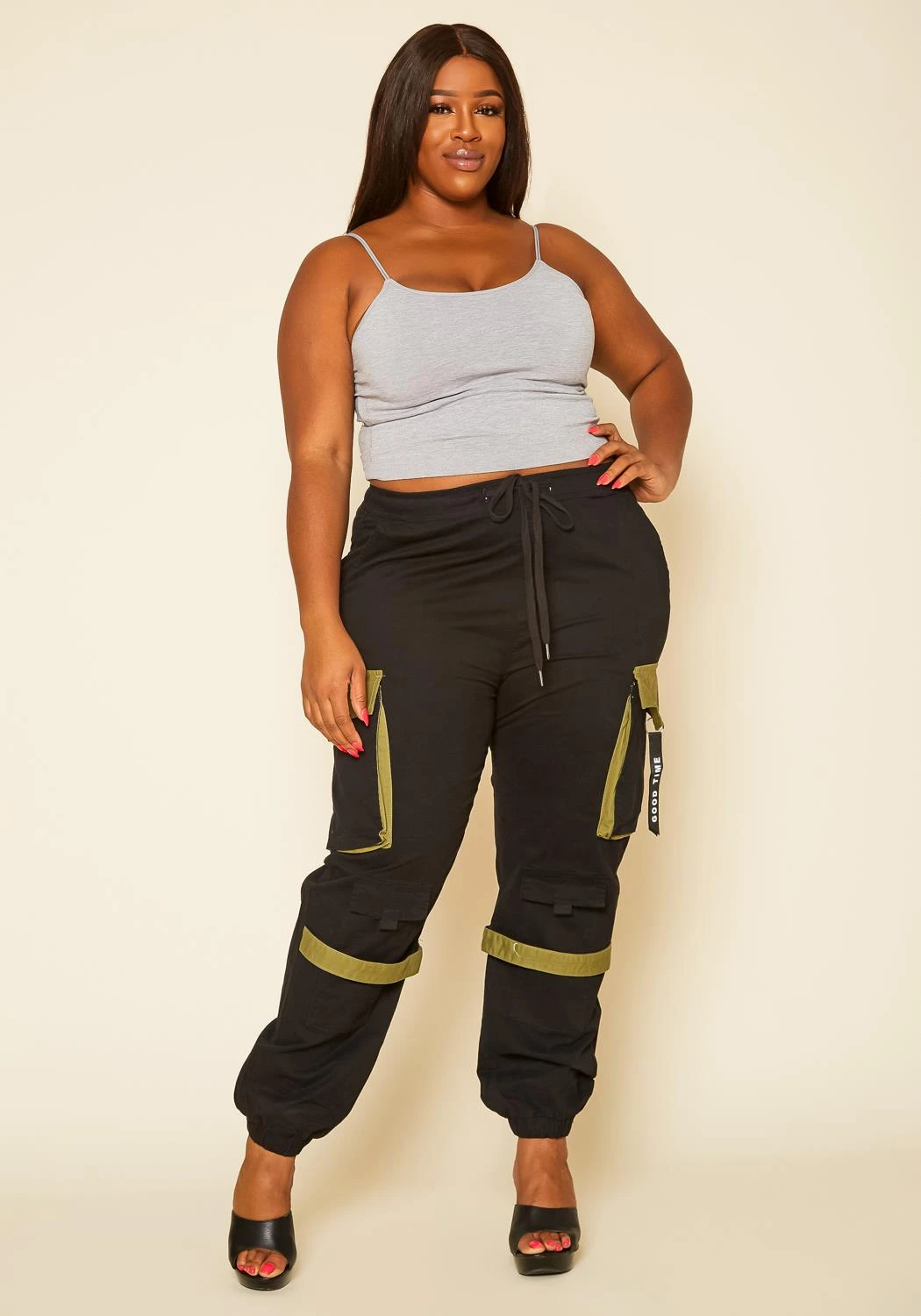 Plus size women’s versatile cargo pants in camo pattern, pop of color design, waistline drawstring hem, pocket hem and good times statement lanyard.