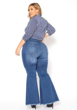 Statement skinny jeans for plus size women in black color denim, front/back distressed details, pockets, belt loop holes and high waist style.