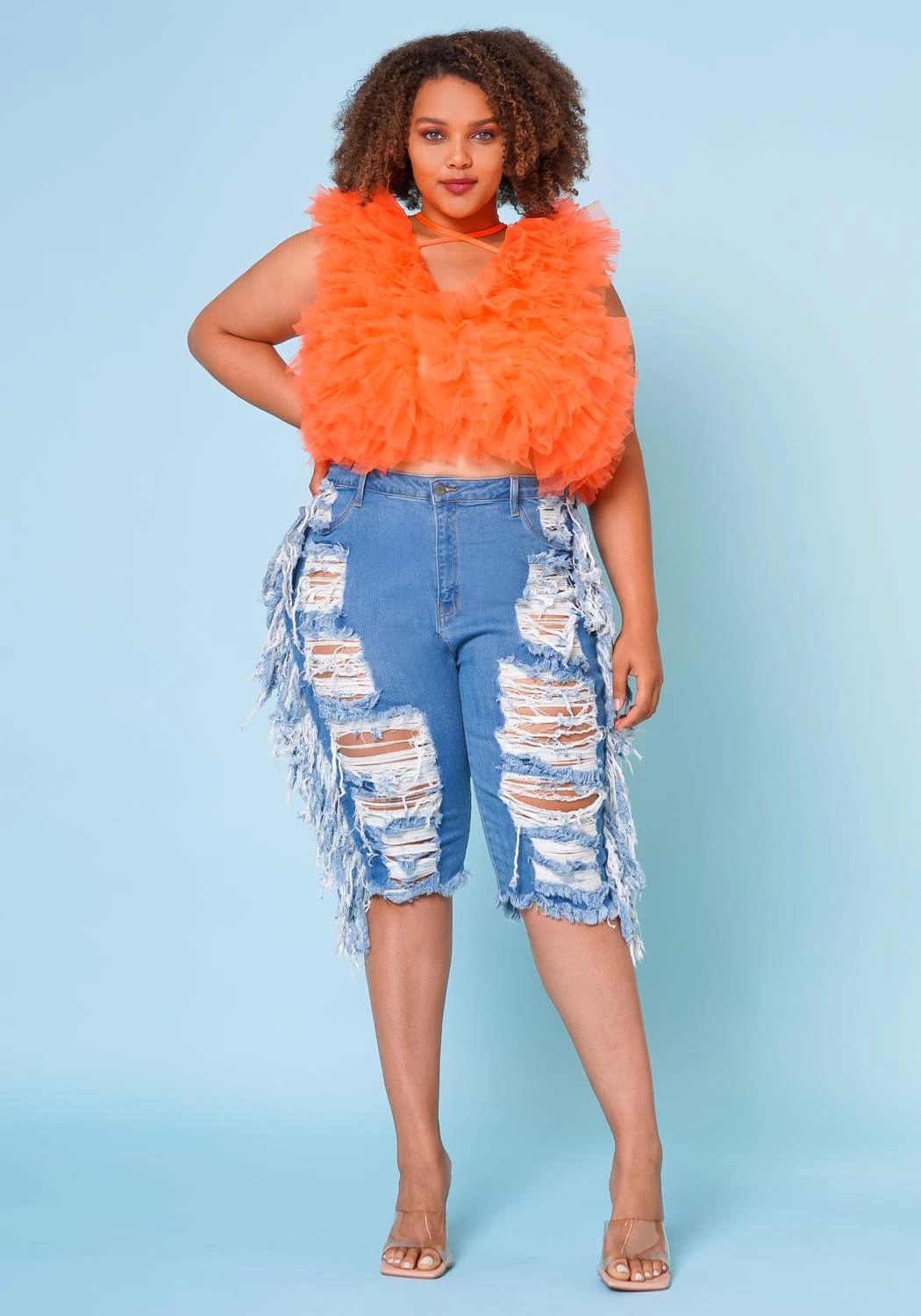 Summer fav denim biker shorts for plus size woman which features a high waist style, distressed front/back hem, belt loop holes and pockets.
