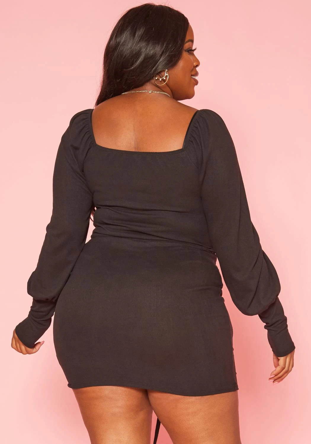 Favorite plus size women’s matching set with centered drawstring hem, v-neck style, long sleeve crop top and high waist bodycon mini skirt.