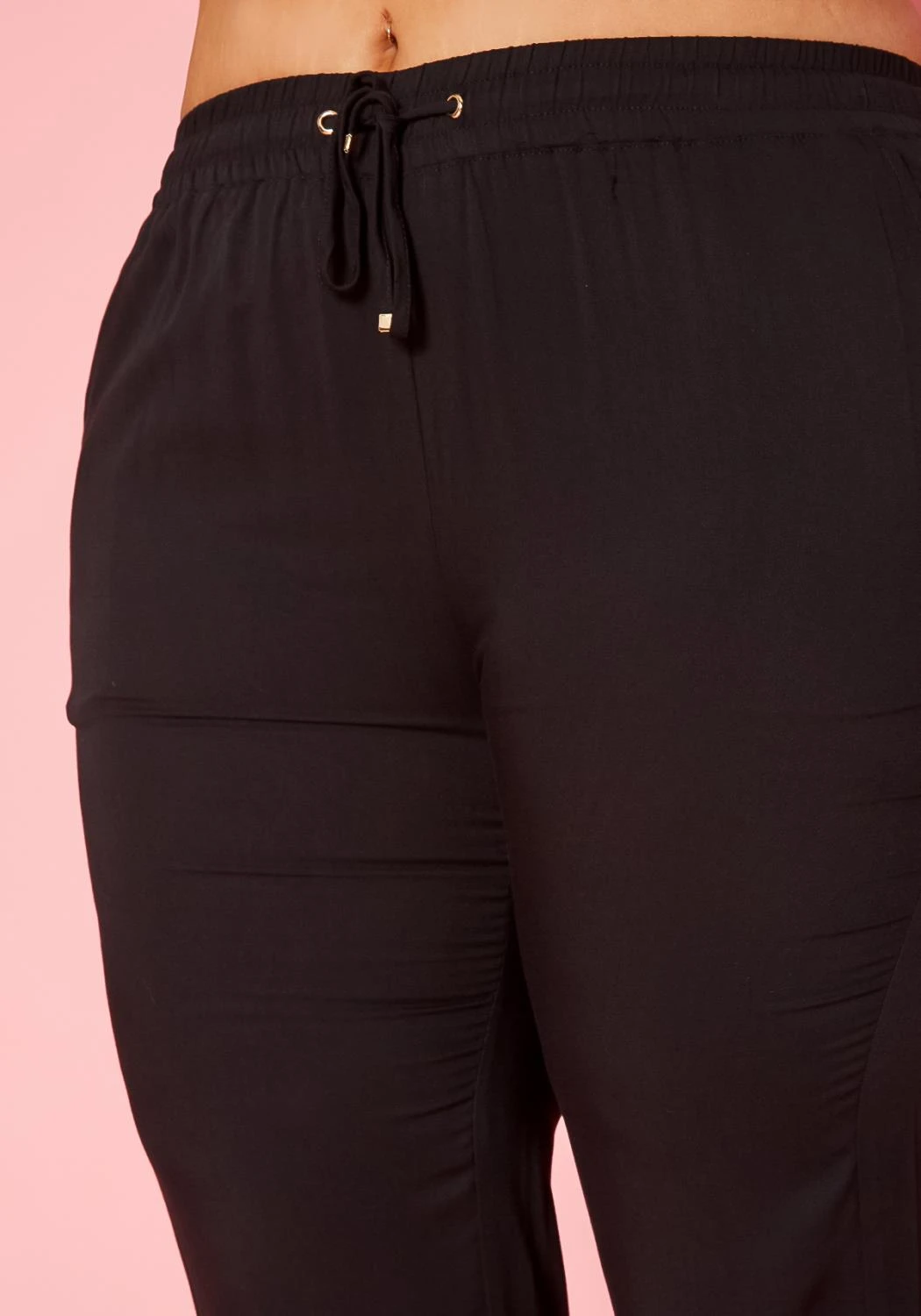 Plus size women’s pants featuring a elastic waist with a drawstring closure, front side pockets, one back faux zipper pocket detail and tube elastic leg cuff hem.