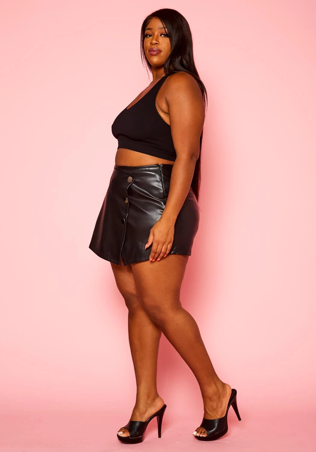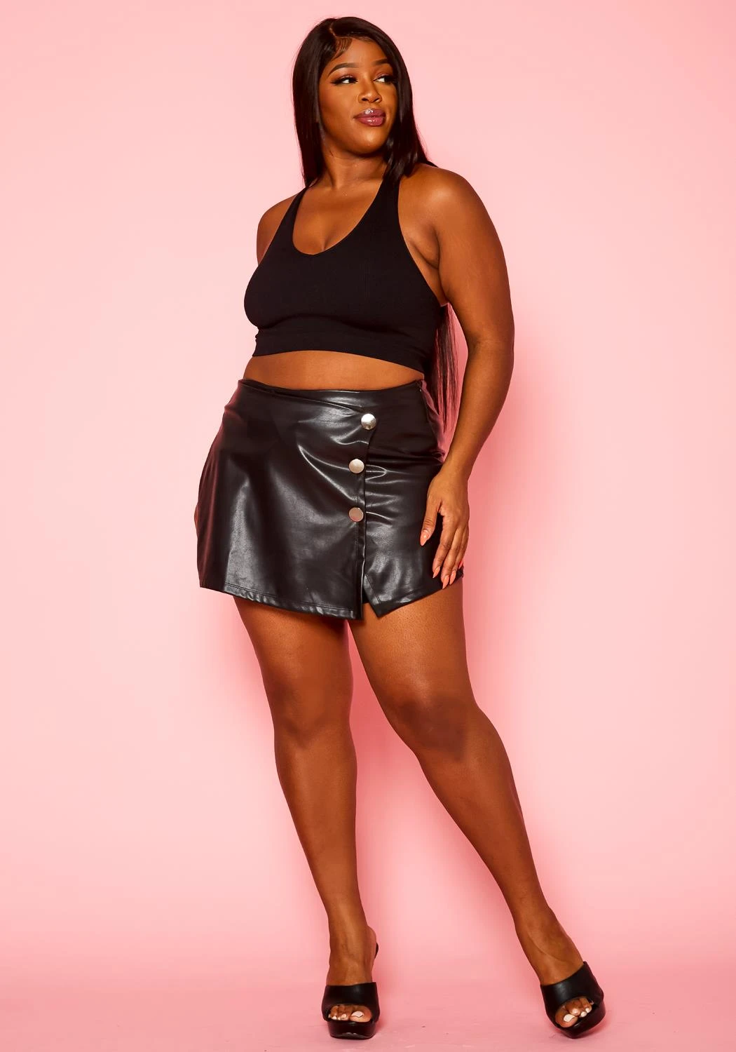 Stylish plus size women’s faux leather skort in high waist style and button front details.