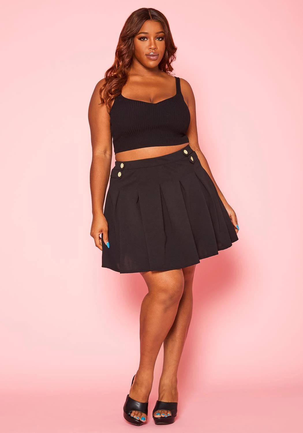 Plus size women’s skirt, featuring pleated detail, flare style & front faux button detail.