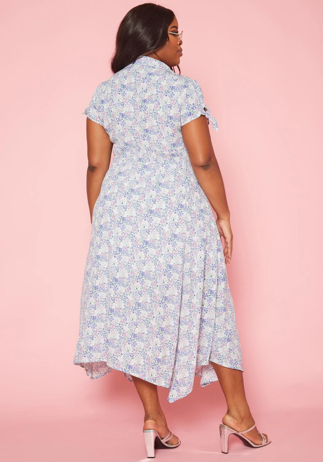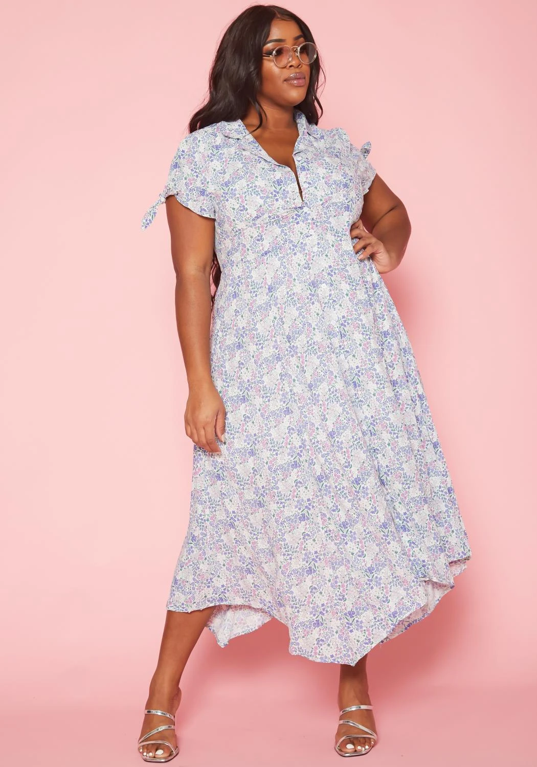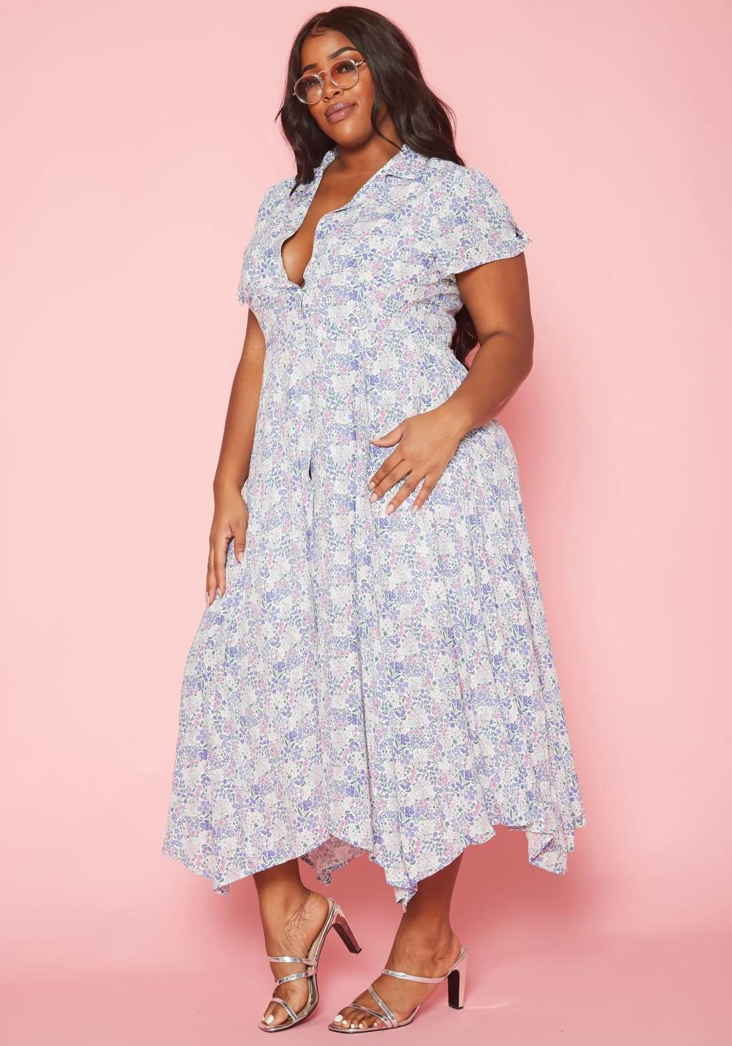Effortless plus size women maxi dress in floral pattern, fit to flare design, asymmetric hem, short sleeve, collar neck, front button closure and v-neck style.