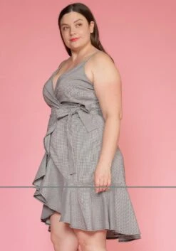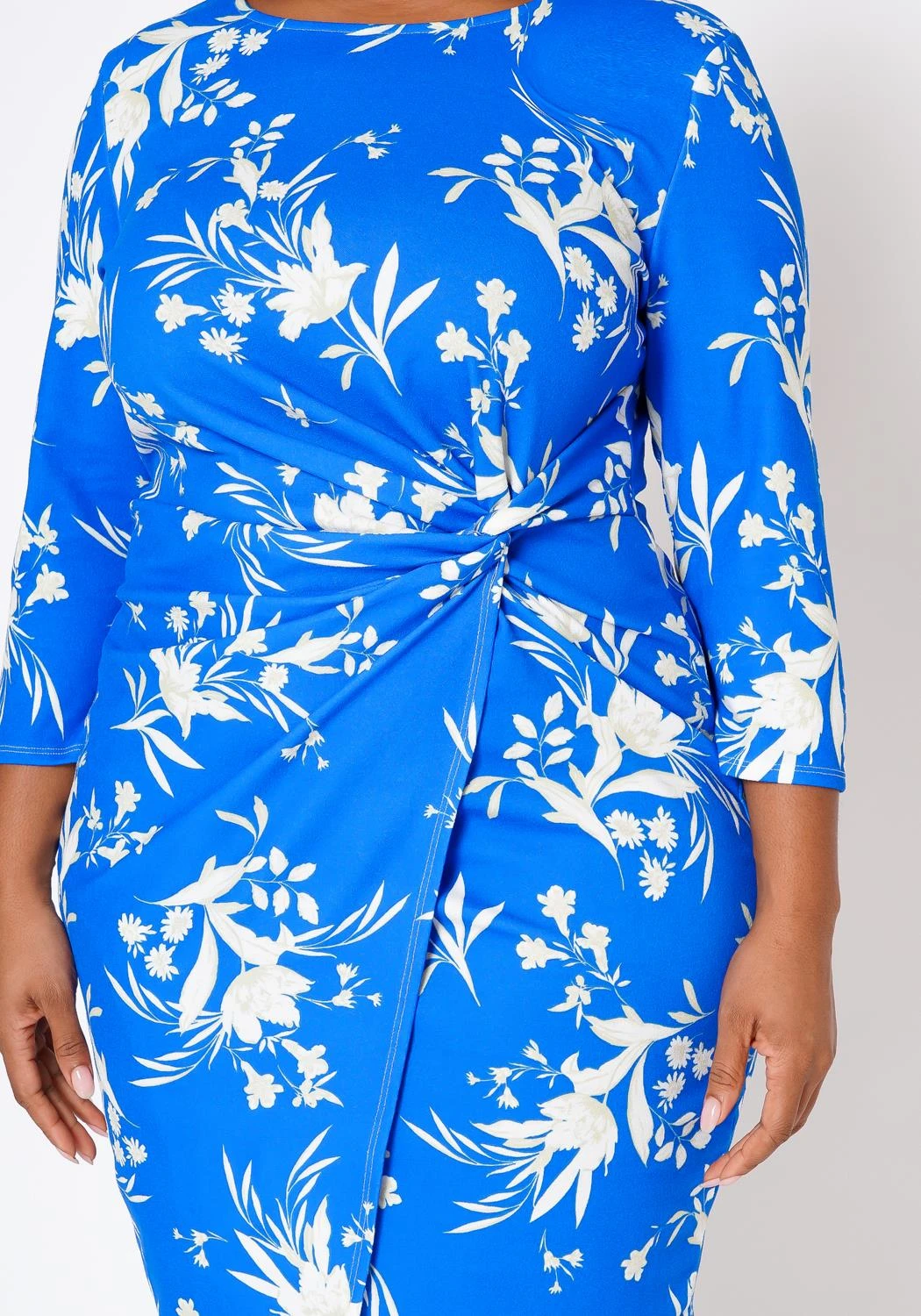 Elegant plus size women’s cocktail dress with lovely twist hem overlay design, 3/4 fitted long sleeves and round neckline.