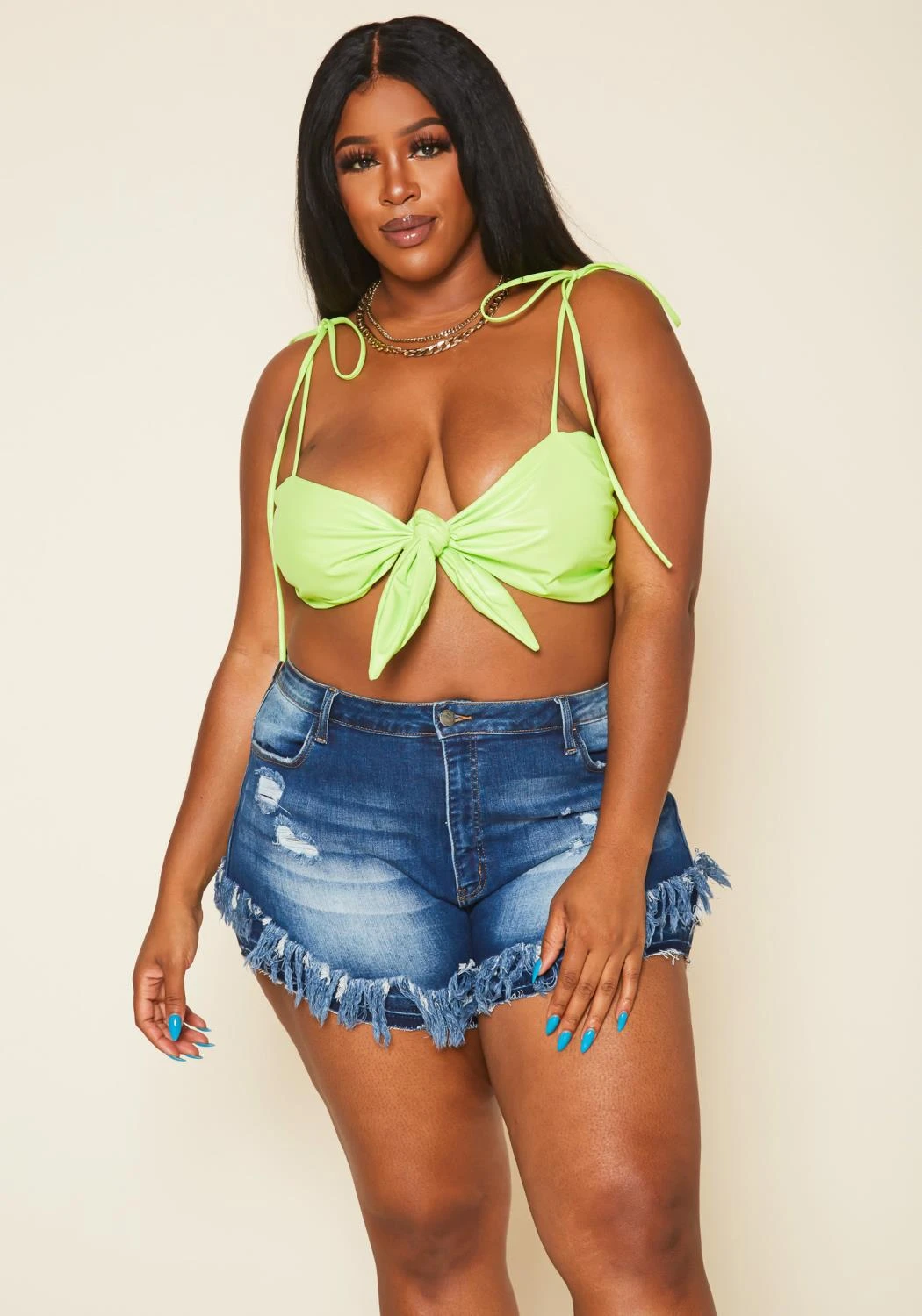 Summer hits different with stylish denim shorts! This plus size pair features a blue fade wash, mid rise fitting, pocket hem, belt loop holes distressed details and fray hem.