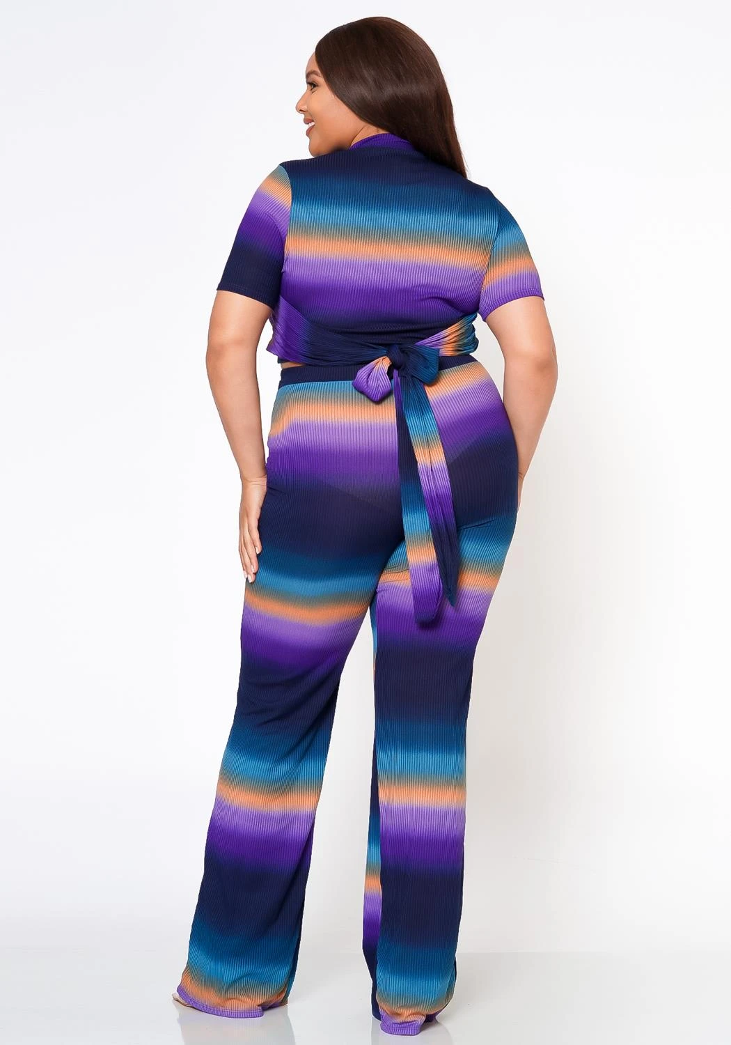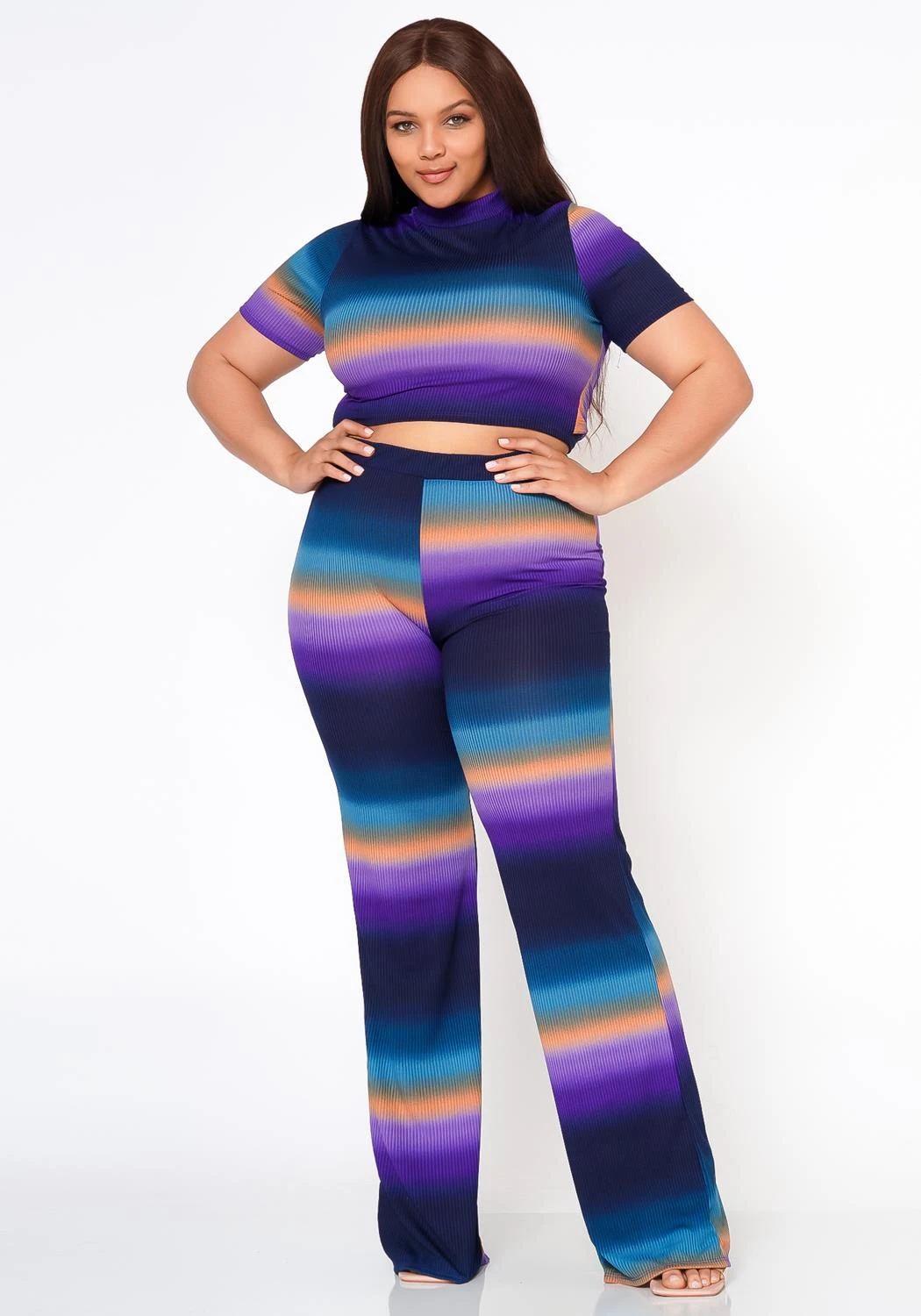 Alluring plus size women’s ribbed matching set which features gradient color pattern mock neck, short sleeve crop top and high waist flare leg dress pants.