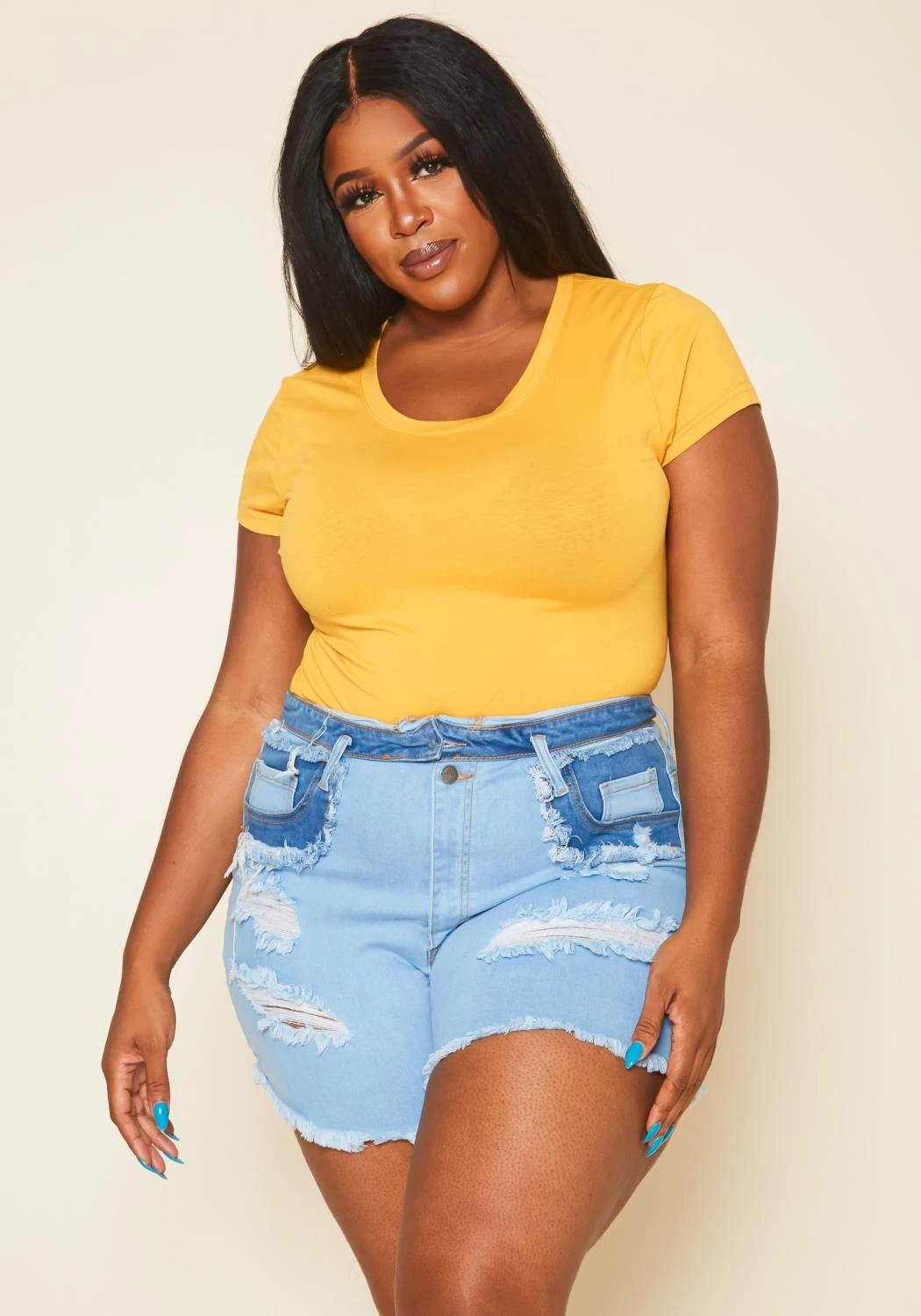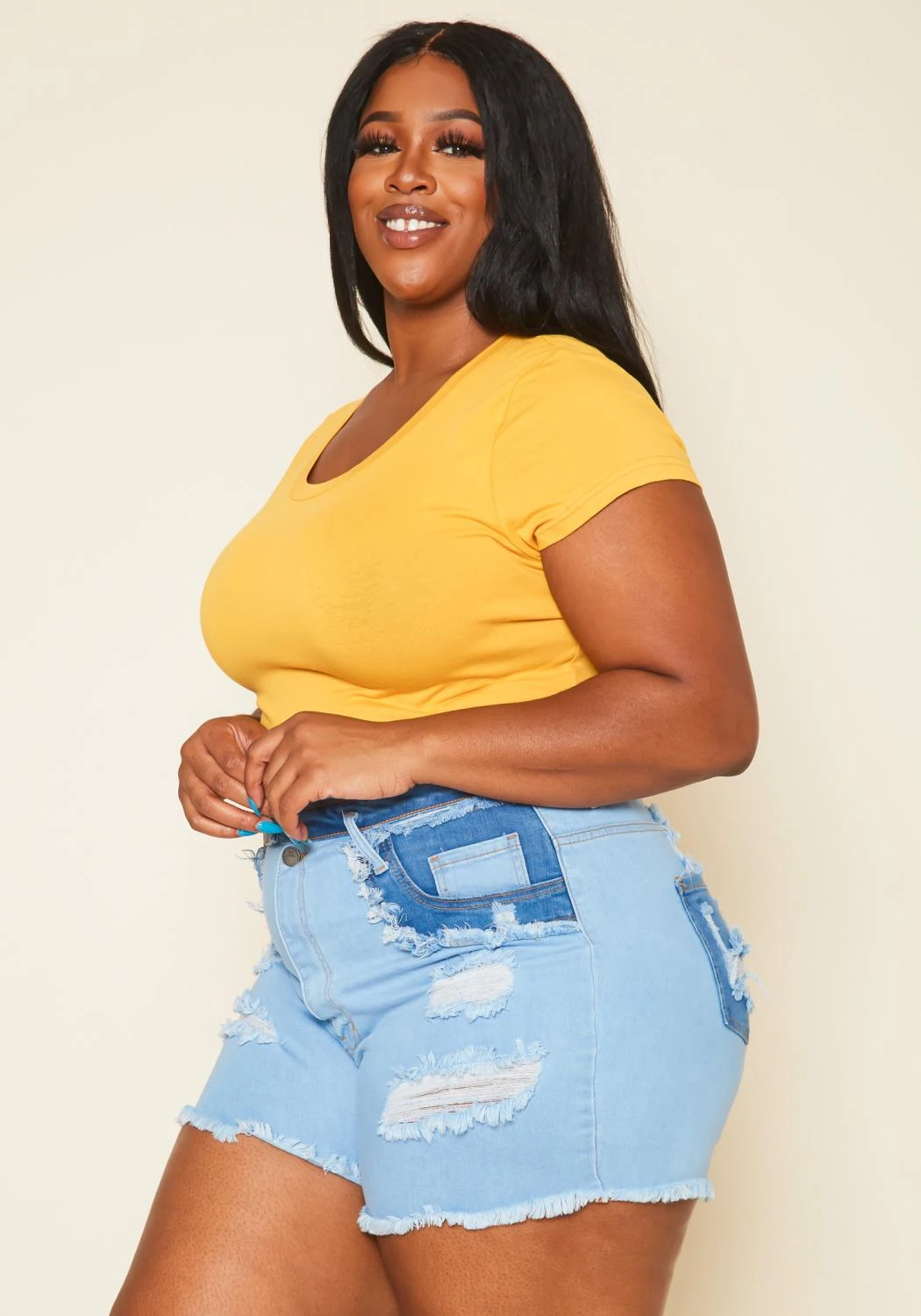 Summer favorite pair of denim shorts in high rise style, stylish distress details, belt loop holes, pocket hem and fitted design.