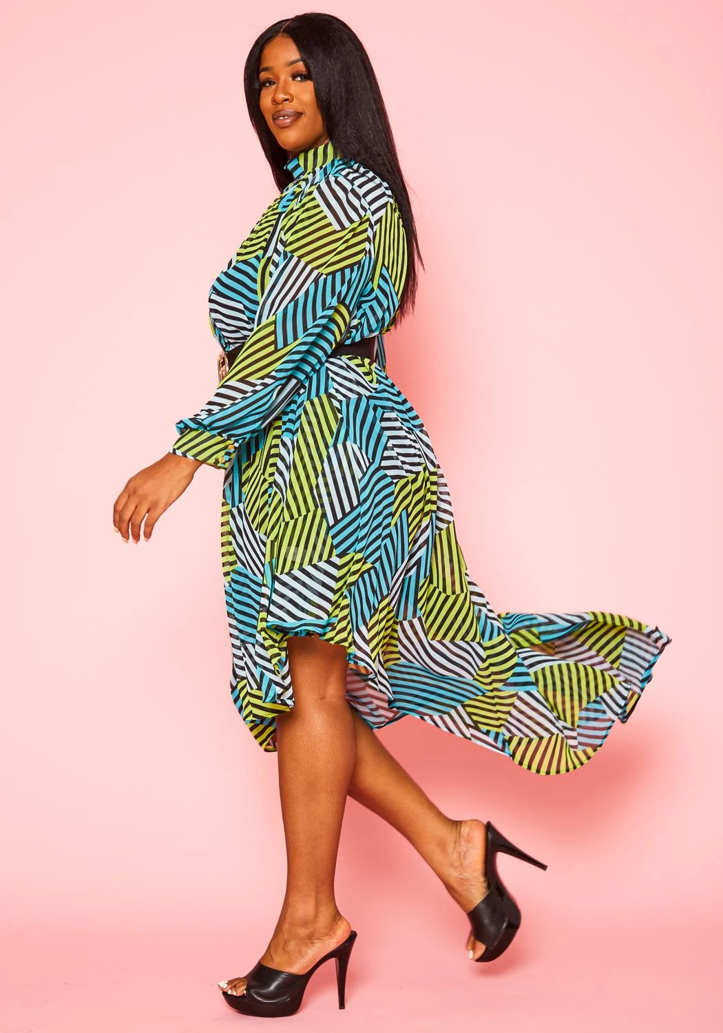 Effortless plus size women’s maxi dress with multi striped design, mock neck style, long sleeves, asymmetric hem and matching waist belt.