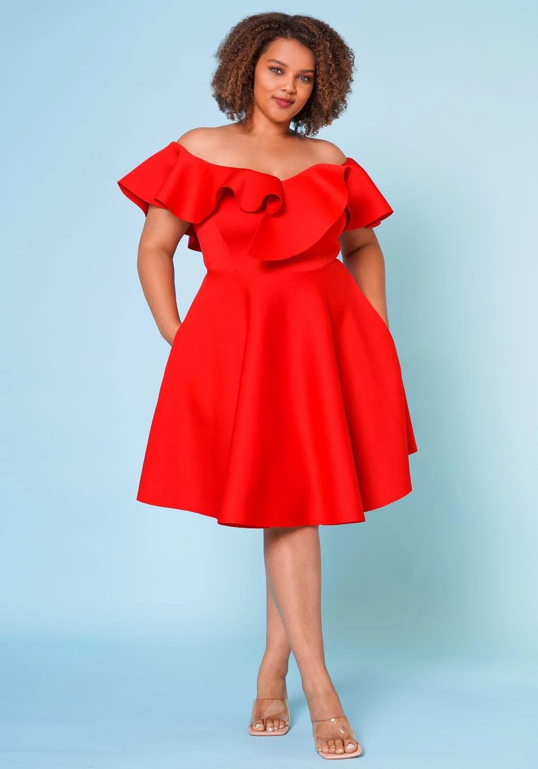 Gorgeous plus size women’s mini dress in off shoulder style, ruffle hem, quality scuba material and pocket ascent.
