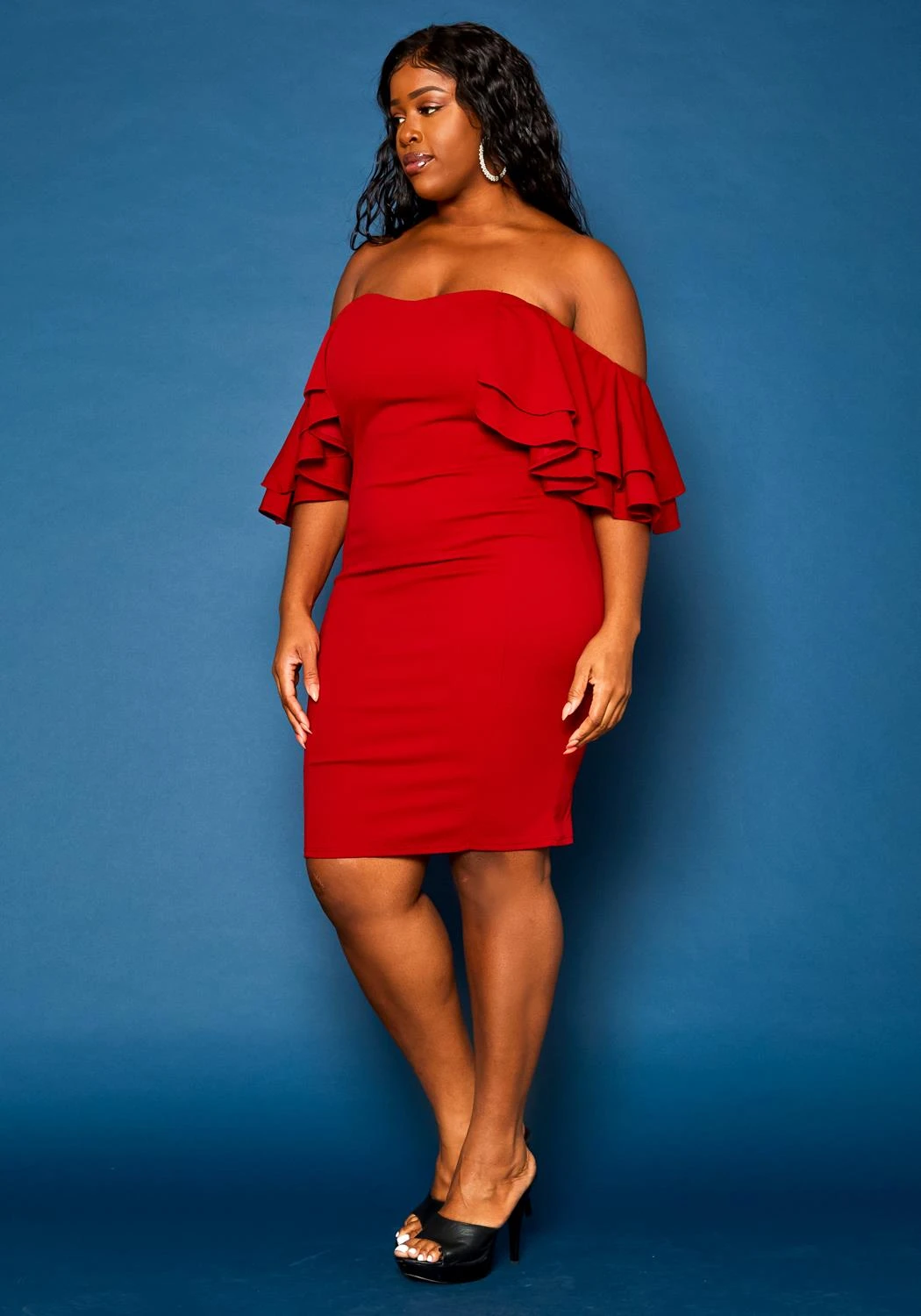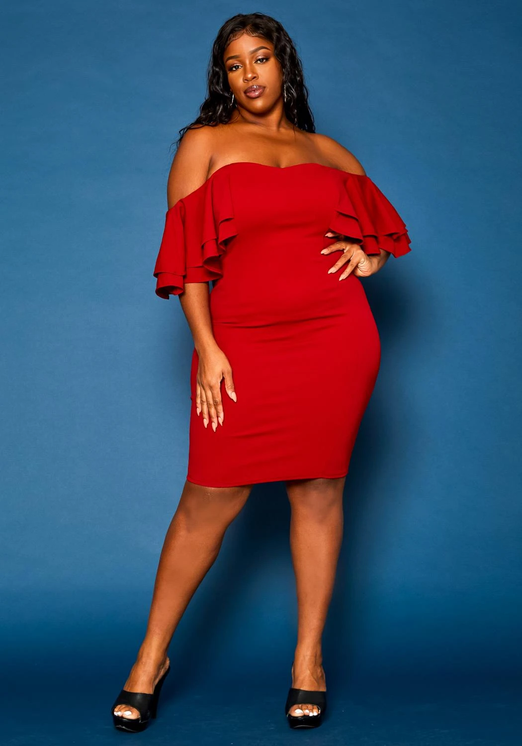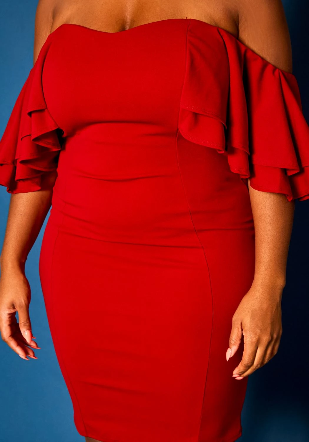 Gorgeous plus size women’s mini dress in off shoulder style and ruffle hem short sleeves.