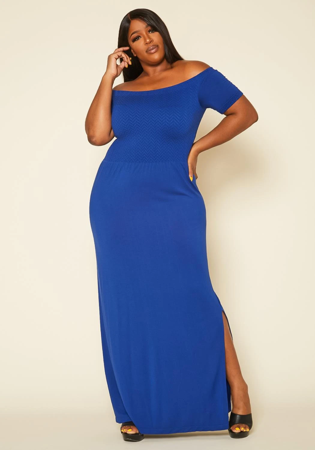 Plus size women’s seamless dress in maxi style, featuring off shoulder ascent, shirred detail with shorts sleeves and side slit detail.