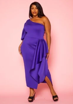Memorable plus size women’s gown in one sleeve style, drape front details and back zipper closure.