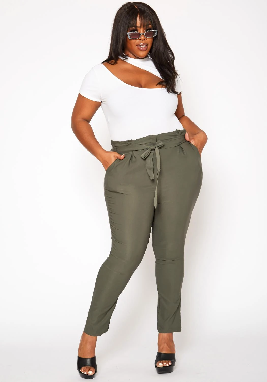 Chic plus size women’s skinny pants in paperbag hem high waist style and waist belt ascent.