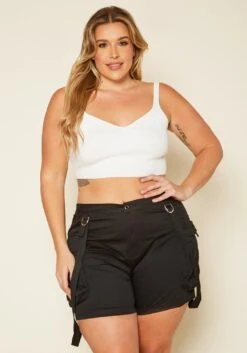 Trendy denim shorts for plus size women in patchwork denim design, high waist style, fray distressed details and pocket hem.