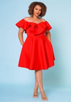 Sophisticated plus size women’s mini dress with peplum flare, v-neckline and 3/4 long sleeves.