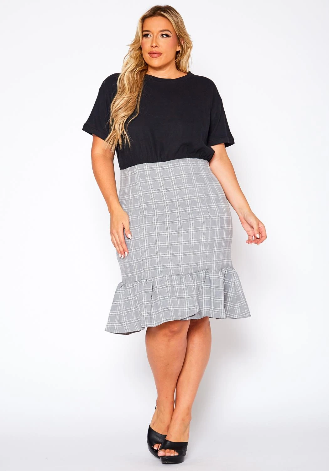 Chic plus size women’s skirt in plaid pattern, high waist style and ruffle flare hem.
