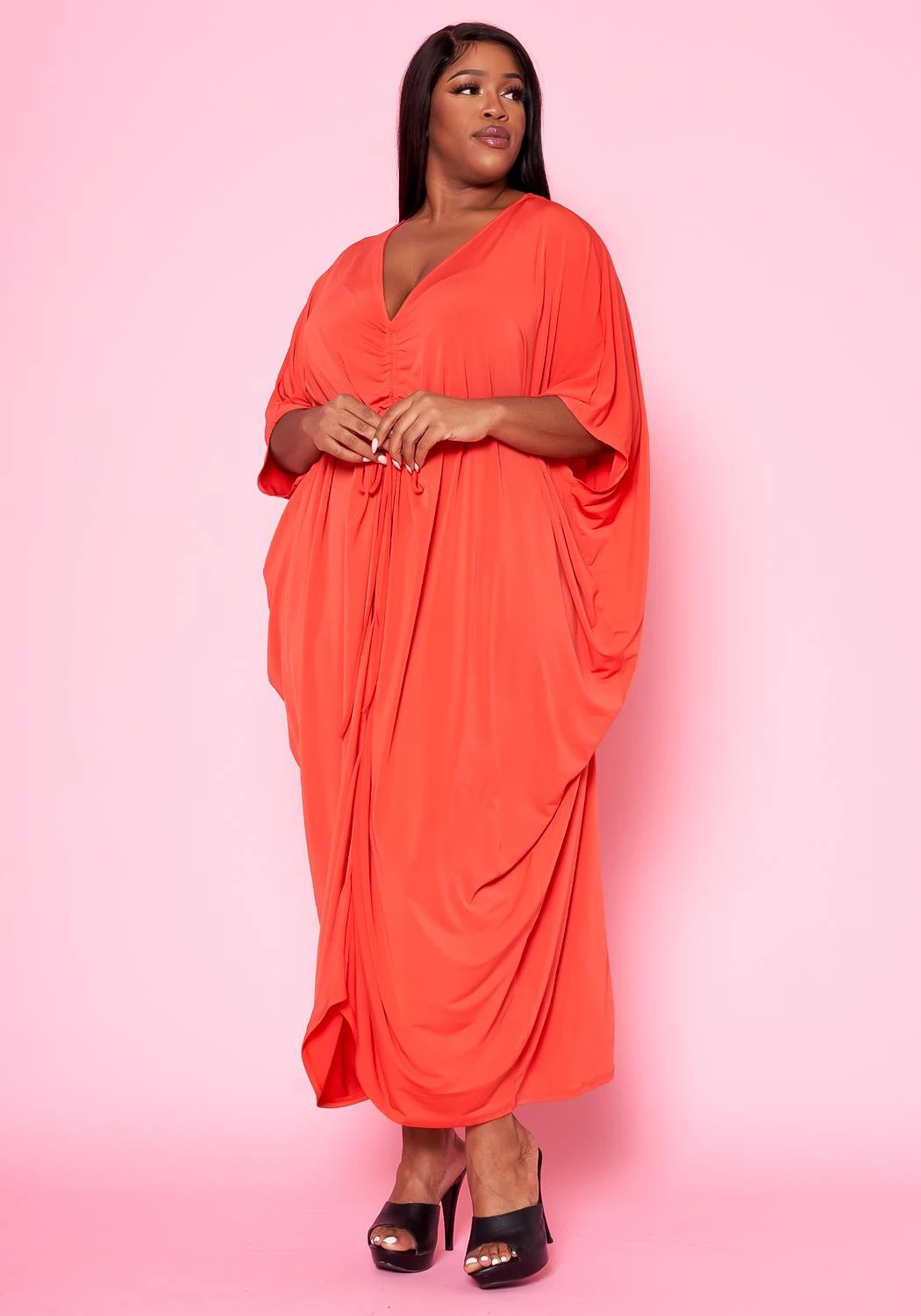 Flattering plus size women’s maxi dress featuring a centered drawstring hem that puts on a ruched effect, dolman sleeves and v-neckline. It can be worn as a maxi dress, great cover up for the summer.