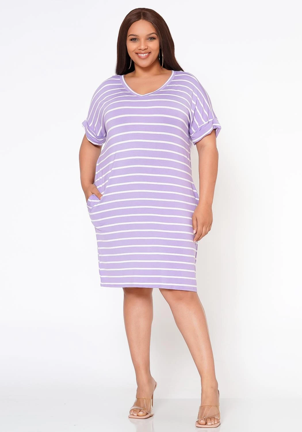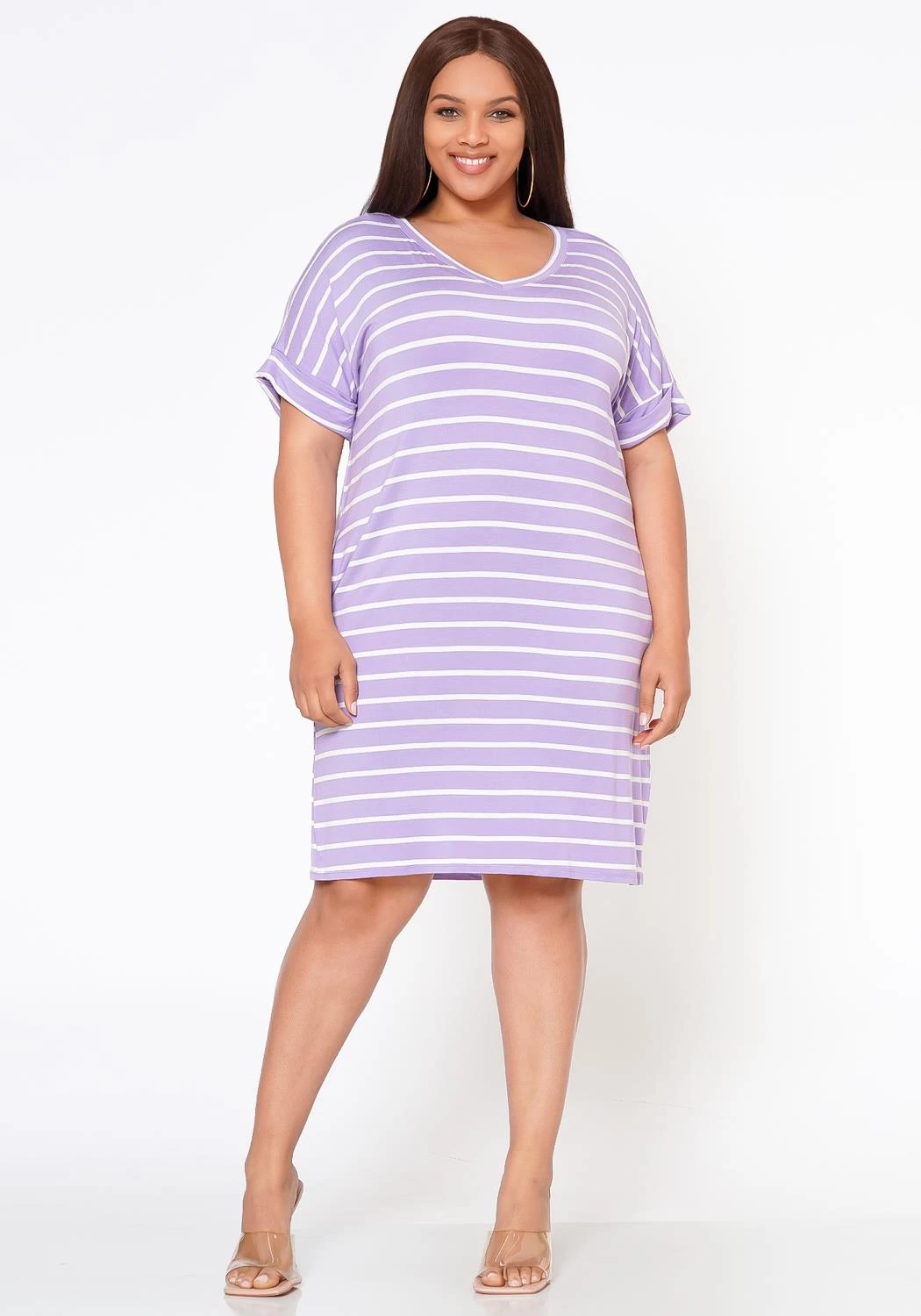 Relaxed fit plus size women’s mini dress in rolled up detailed short sleeves, horizontal striped print and v-neck style.