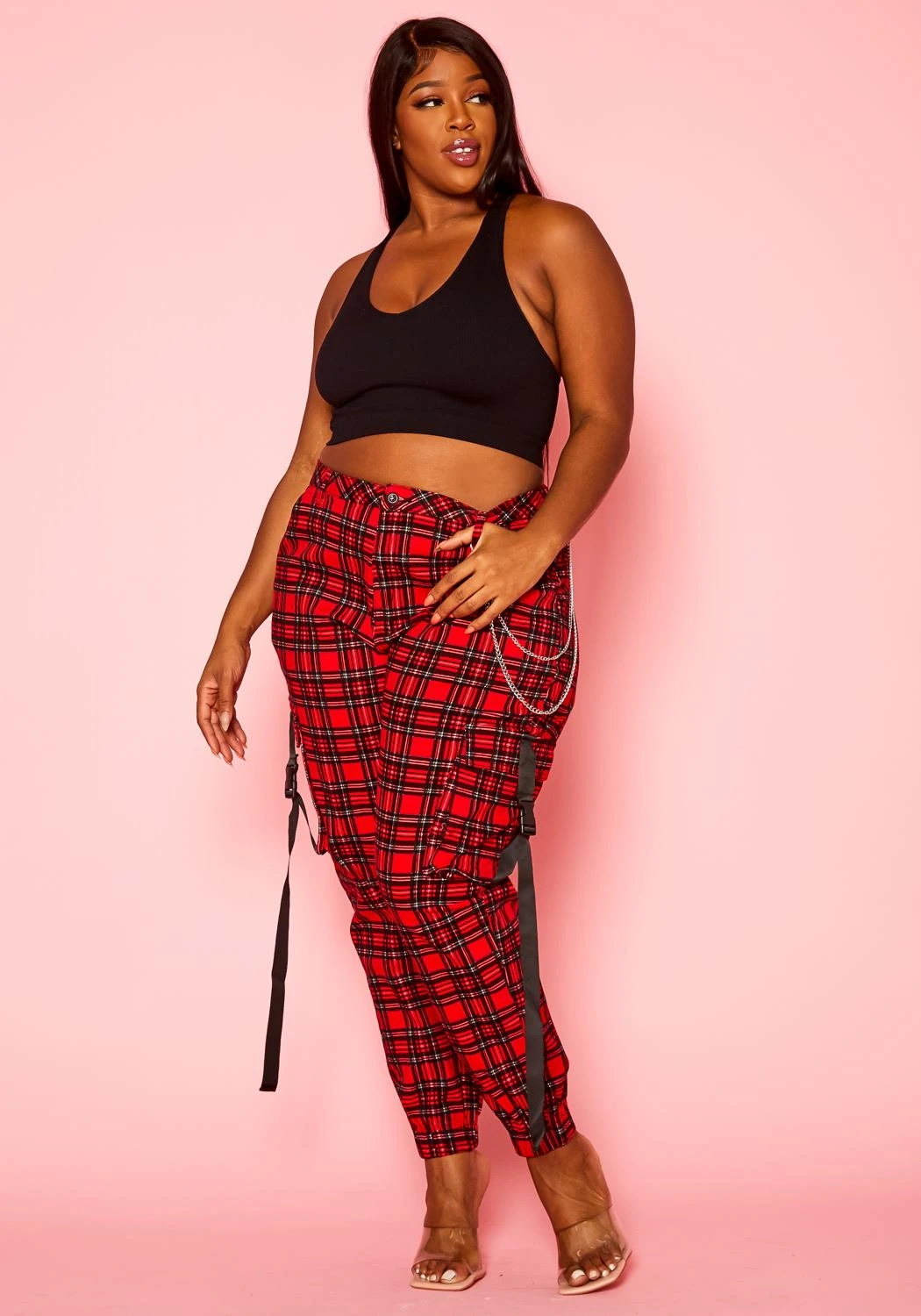 Plus size women’s staple cargo pants in tartan plaid pattern, high waist style, silver chain ascent, pockets and ankle cuff hem.