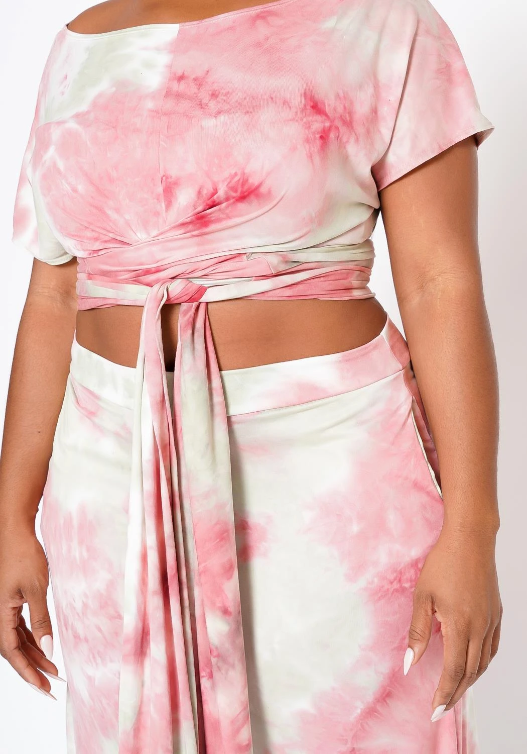 Lovely plus size women’s matching set which features a tie dye boat neckline, tie front crop top and matching high waist straight fit pants with pocket hem.