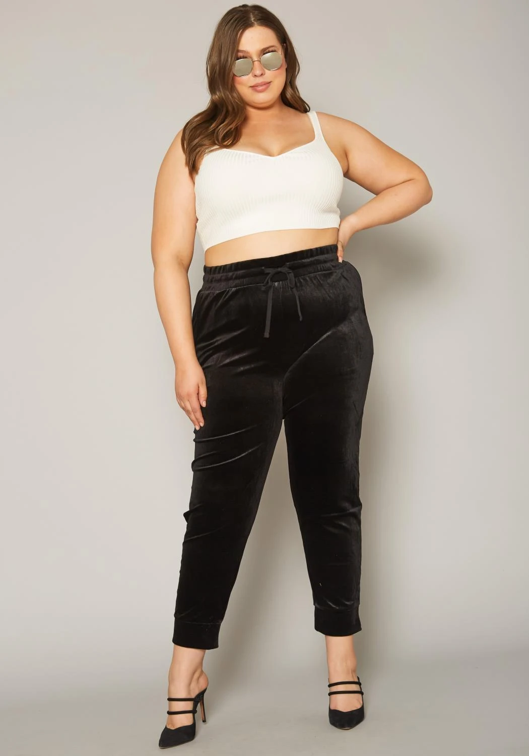 Gorgeous velour pants in high waist style, pocket hem, waistline drawstring hem and fitted ankle hem.