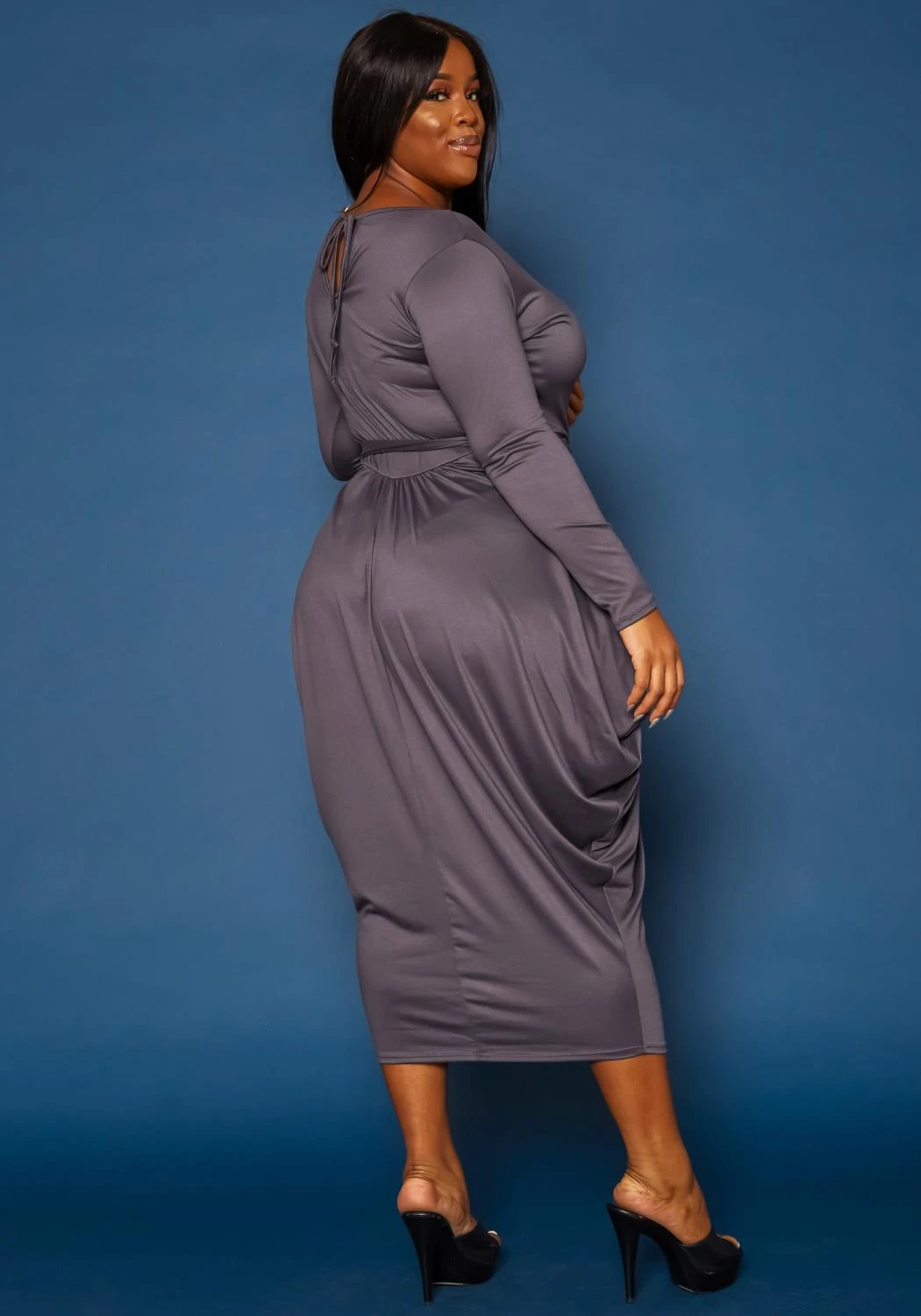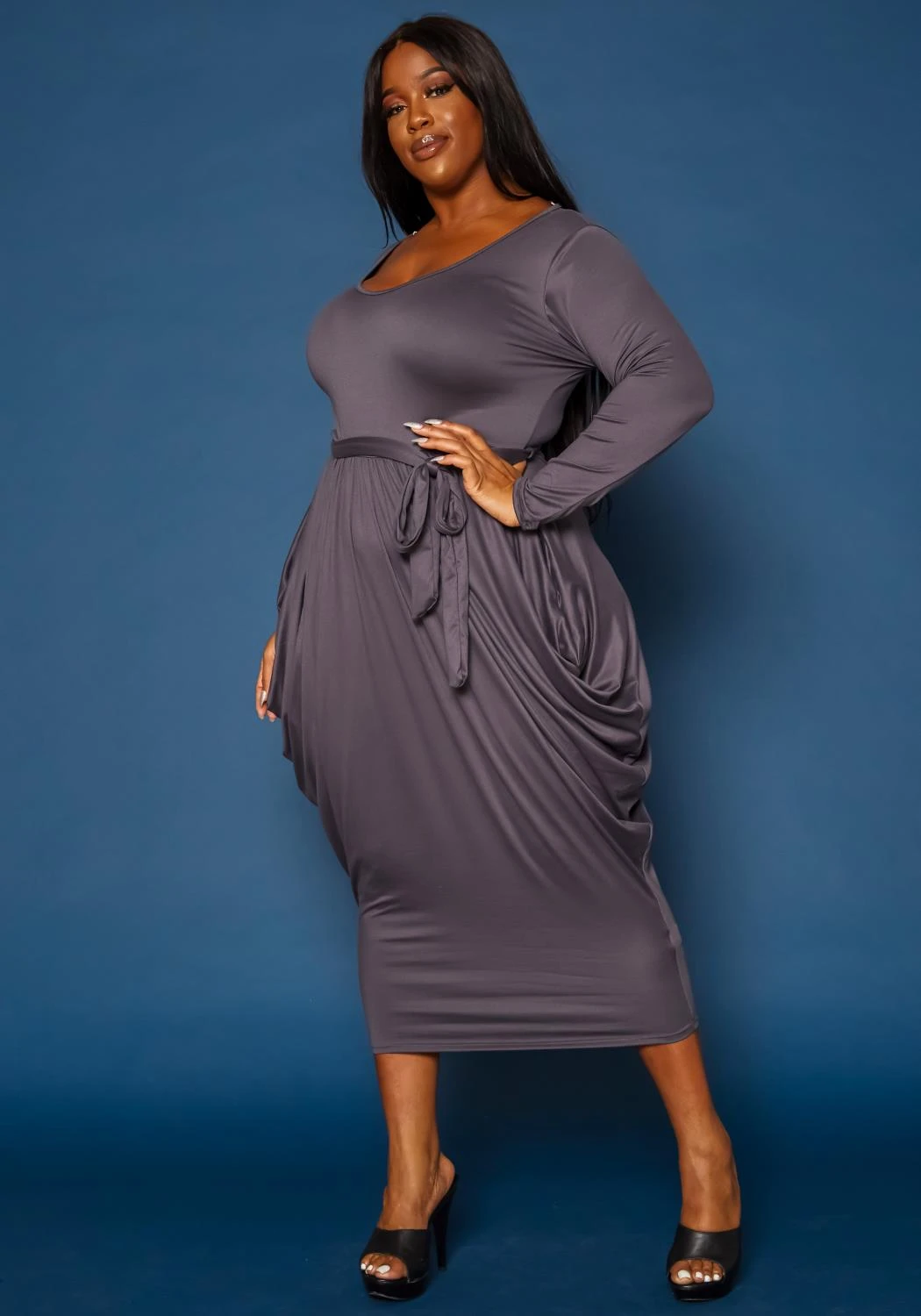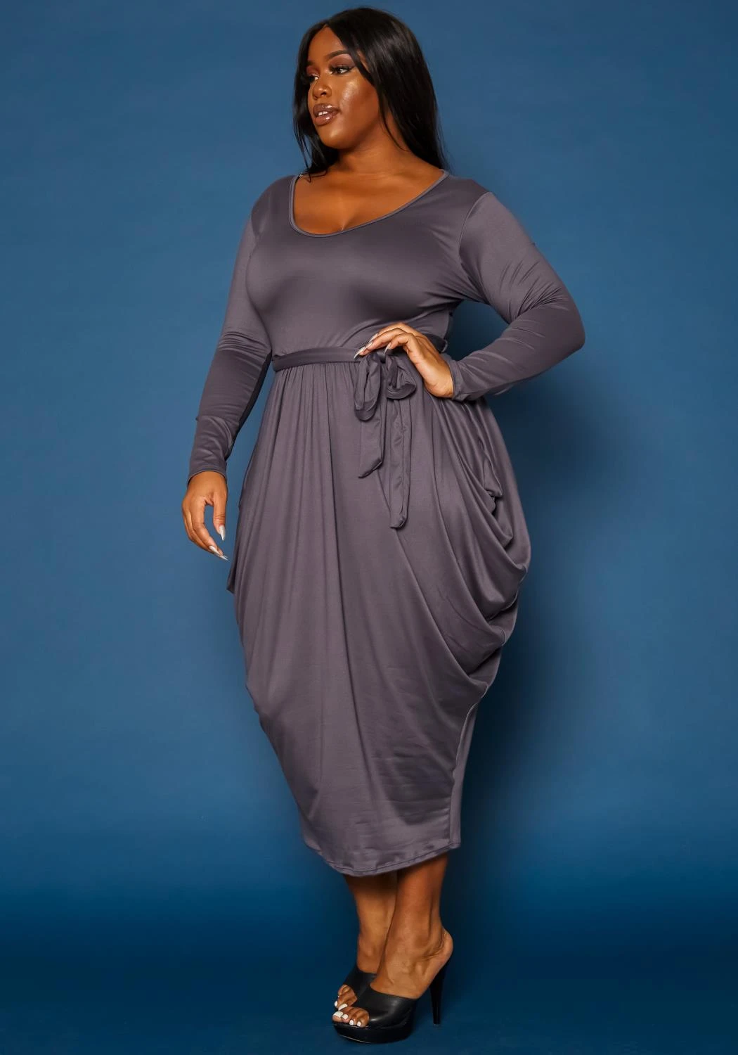 Effortless plus size women’s midi dress in tie dye pattern, v-neck style, long sleeves, harem draped design, waist tie ascent and pocket hem.