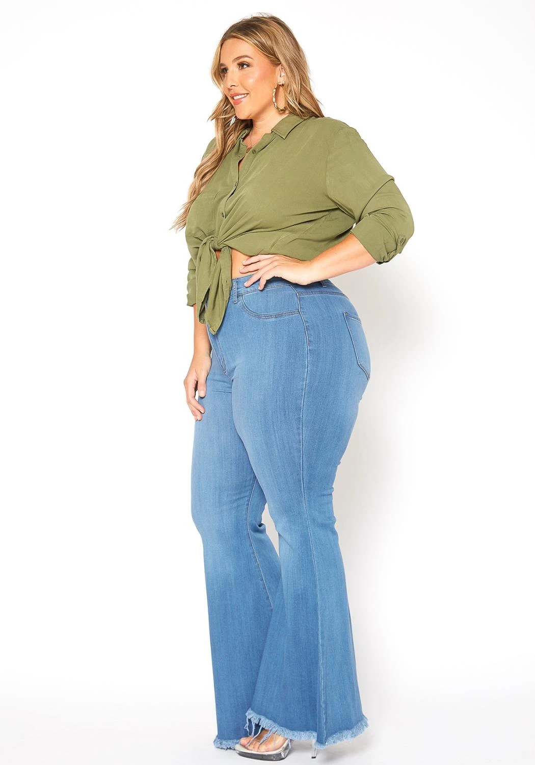 Asoph x Vibrant plus size women’s bold flared bell bottom high waist jean which features a raw cut end hem, belt loop holes and pockets.