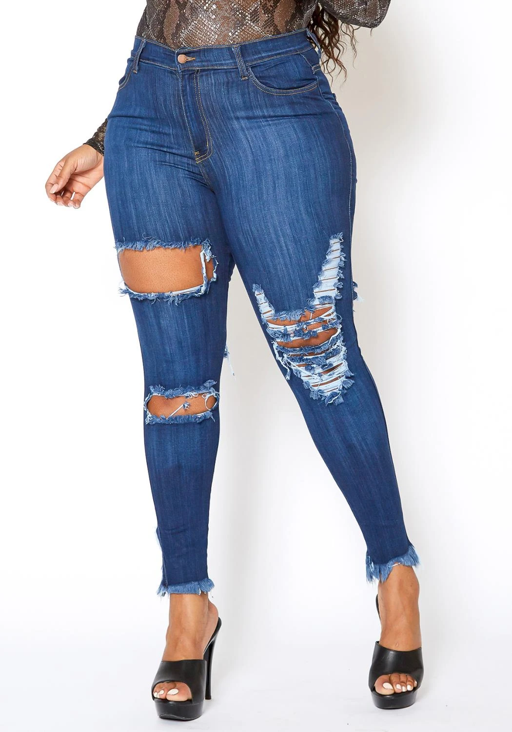 Asoph x Vibrant plus size women’s medium-dark washed denim skinny jeans with front and back distressed hems, belt loop holes and pockets.