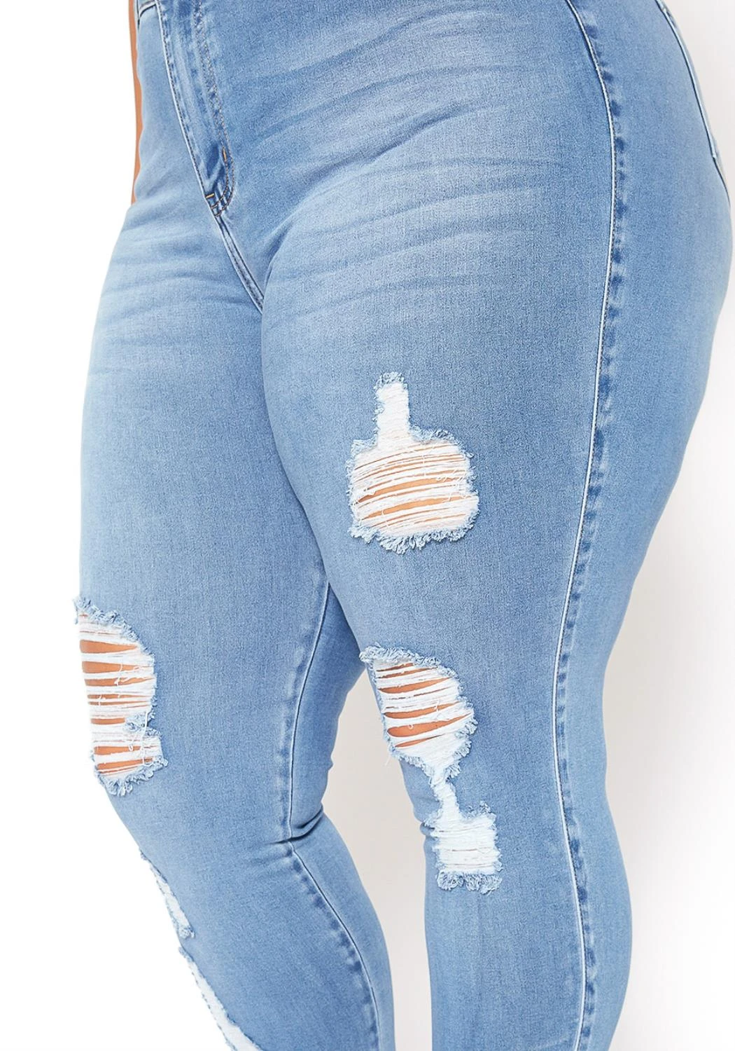 Asoph x Vibrant plus size women’s mid waist skinny jeans in light blue color features distress hems, belt loop holes and pockets.