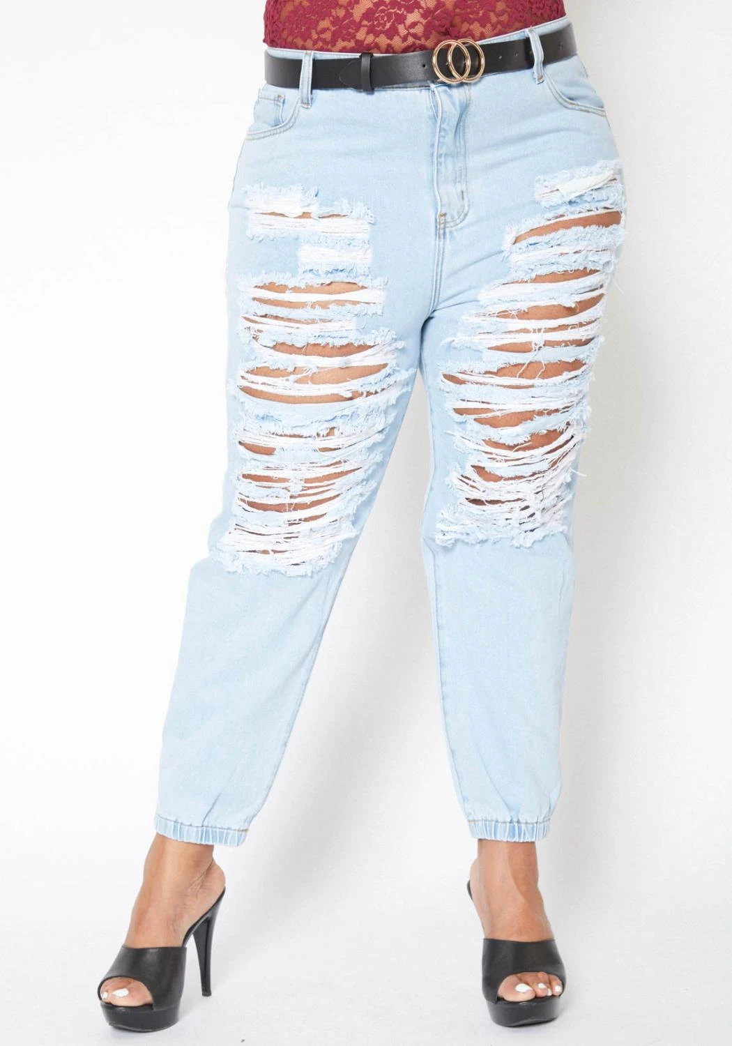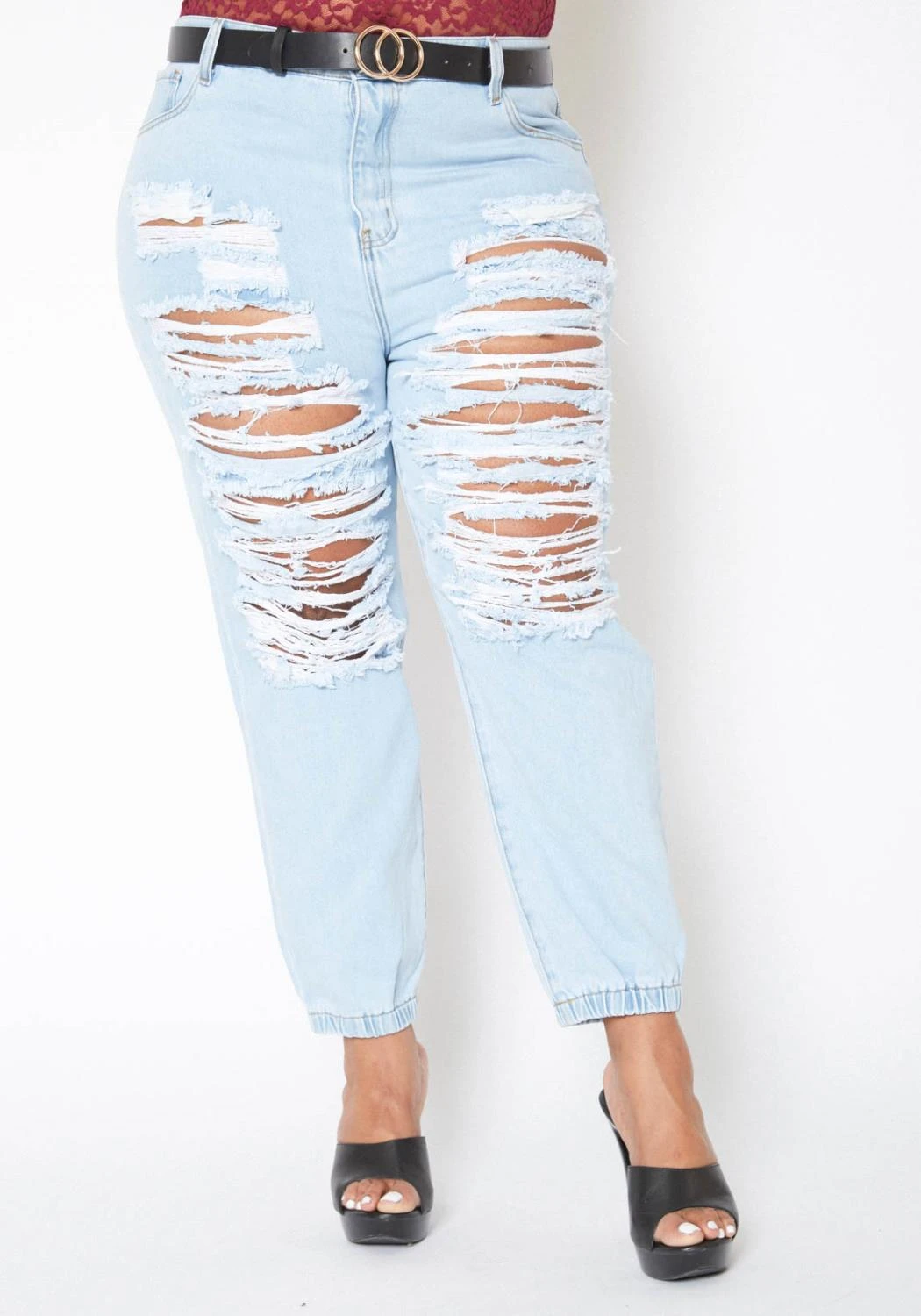 Keep things edgy but chill in the Asoph x Vibrant boyfriend jeans with thigh destroy hems, belt loop holes, pockets, ankle cuff and low rise fit.